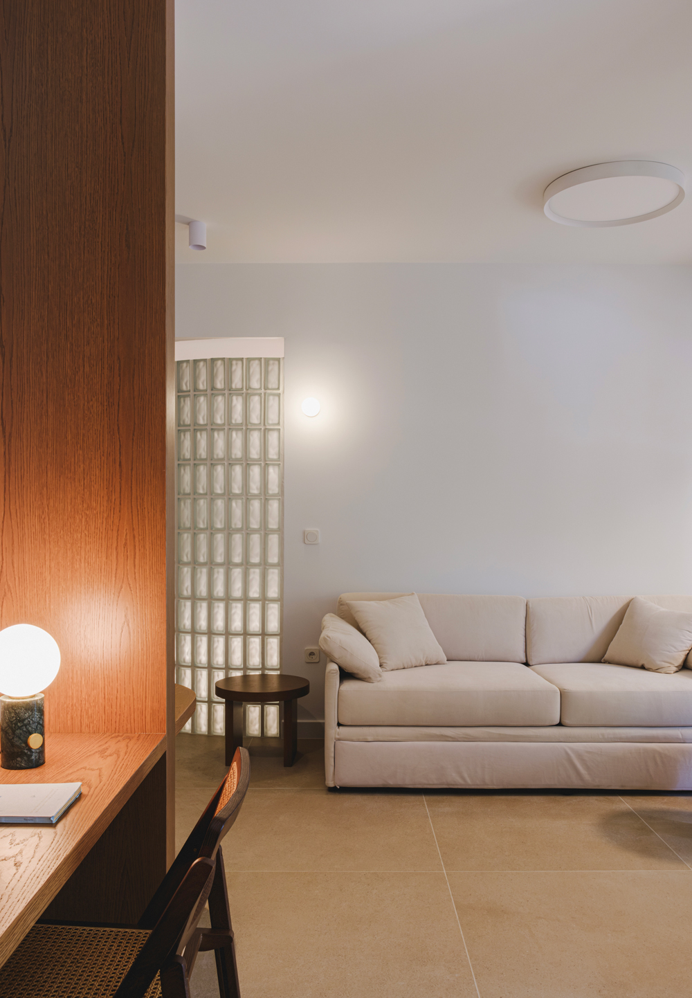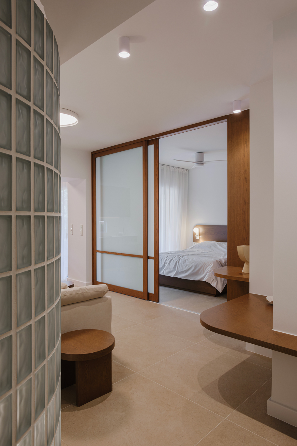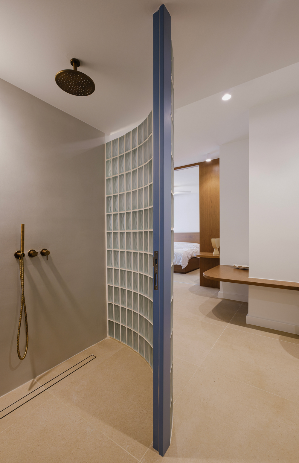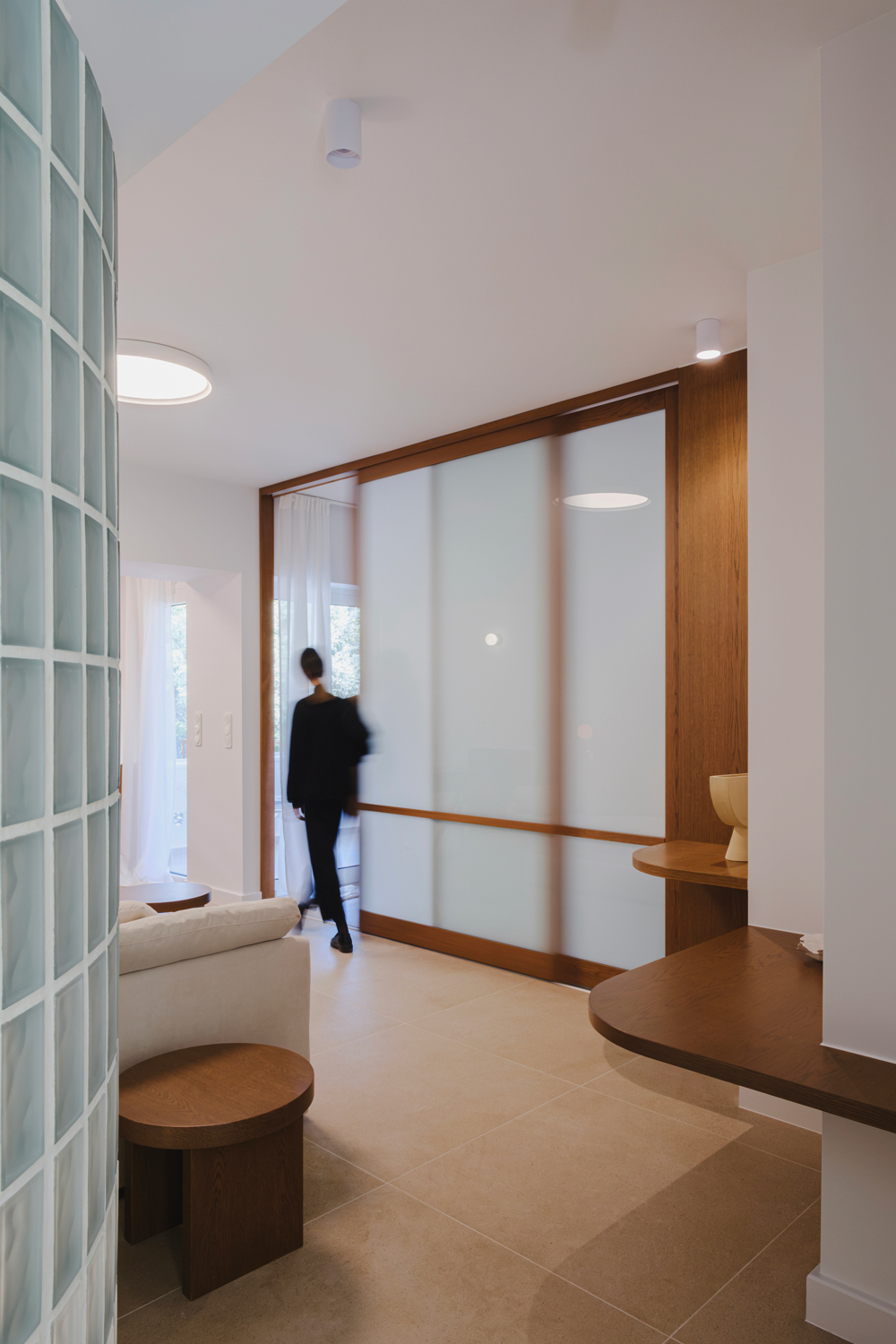 Aphe Architecture Studio has transformed a compact apartment by rethinking the idea of spatial boundaries. Instead of solid walls and doors, the studio created a sequence of layered transitions where passage and boundary coexist. The layout encourages fluid movement through spaces that are softly divided by translucent screens and curved geometries. At the entrance, an unconventional shower placement becomes a feature rather than a constraint, enclosed by glass blocks and framed by a colored door that introduces light and warmth. Natural materials such as wood, ochre tones, sandy textures and glass define the interior. Their combination creates a sensory experience that shifts throughout the day, guided by the changing light. Rather than focusing on flexibility or function alone, the design explores how architecture can foster relationships—between spaces, materials, and the people who inhabit them.