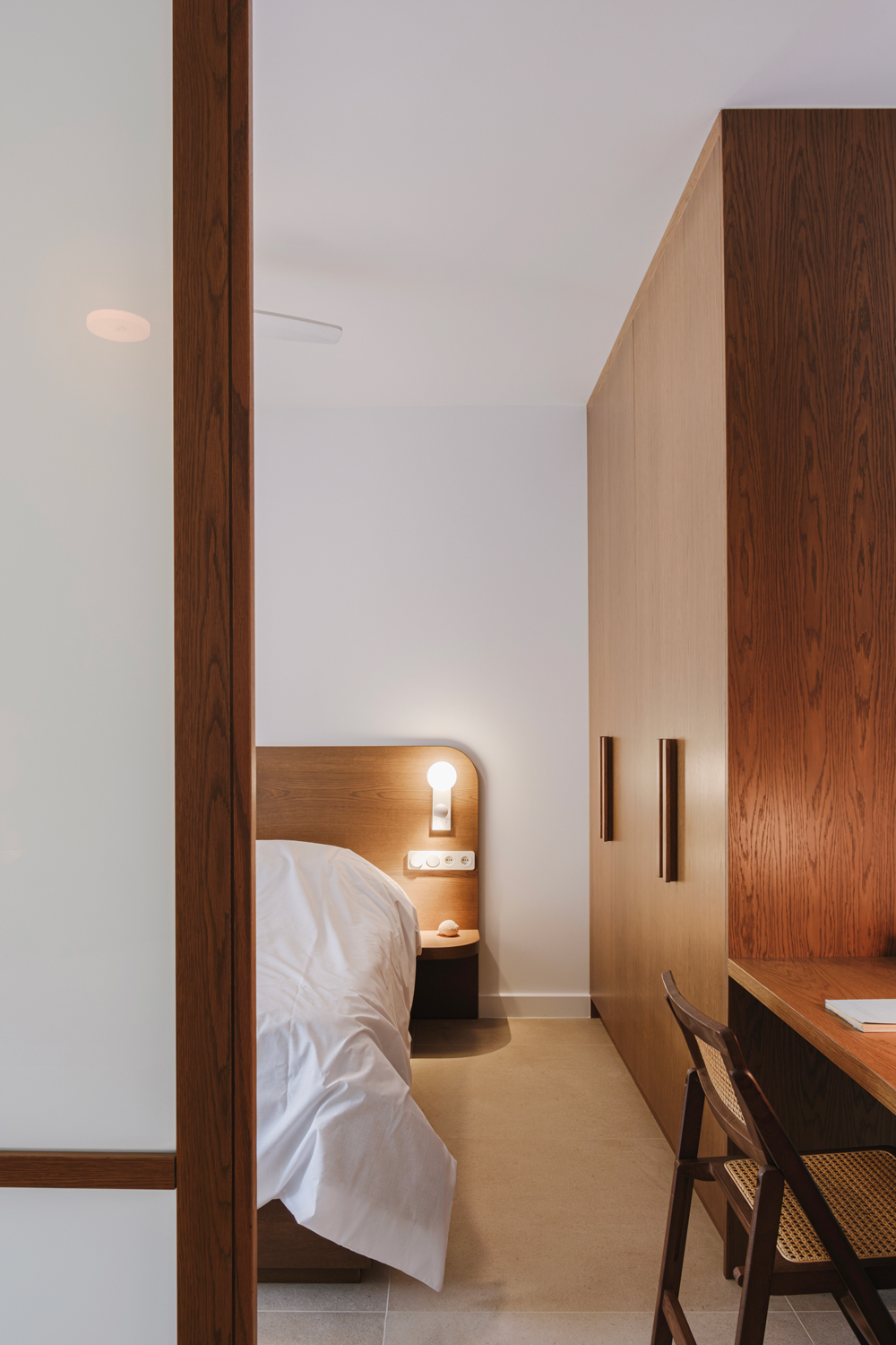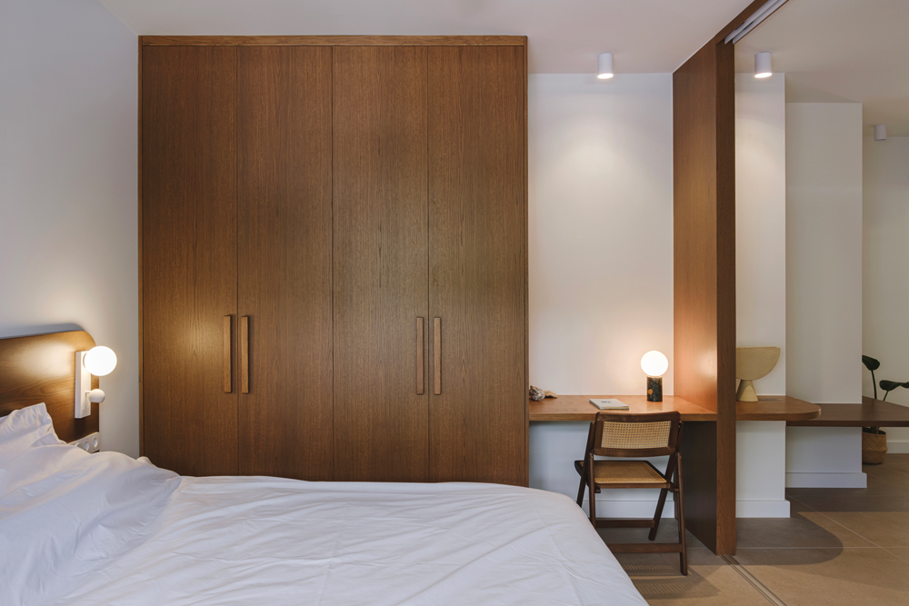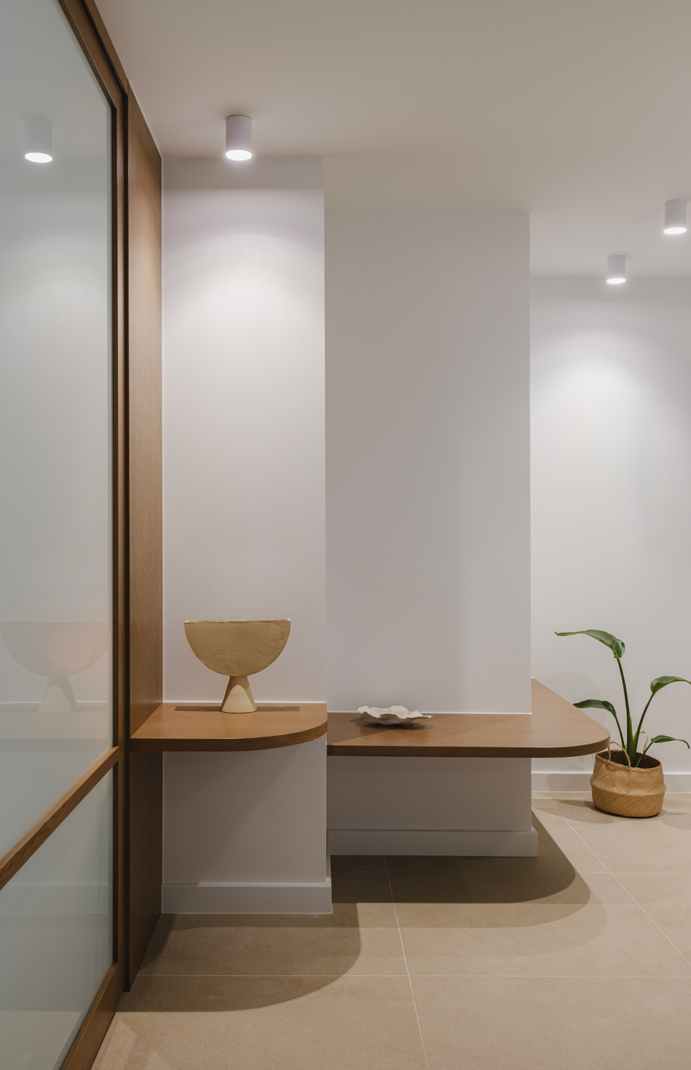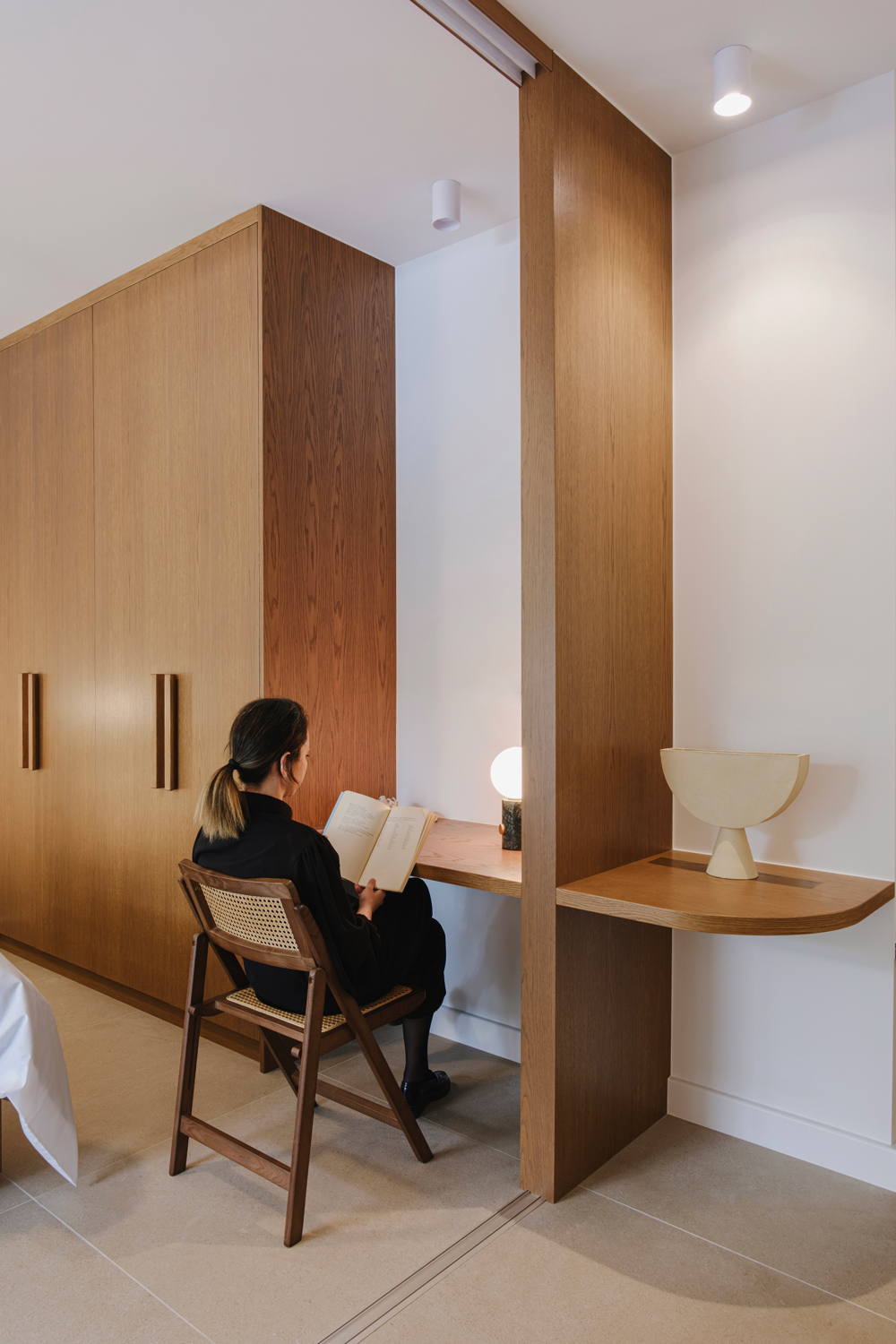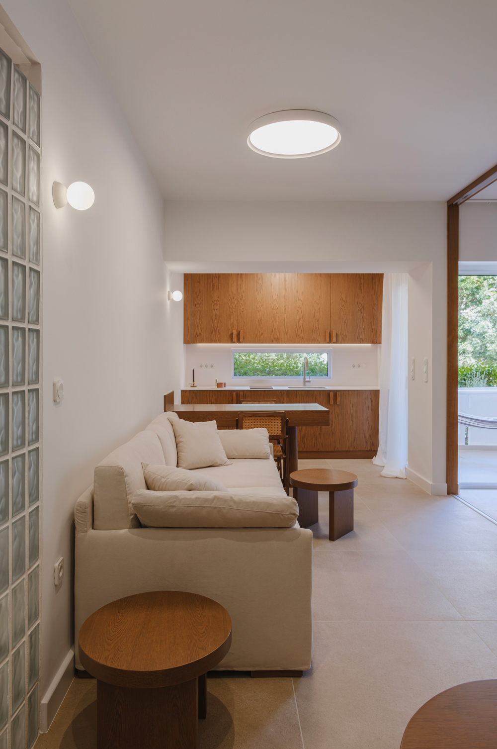 Aphe Architecture Studio has transformed a compact apartment by rethinking the idea of spatial boundaries. Instead of solid walls and doors, the studio created a sequence of layered transitions where passage and boundary coexist. The layout encourages fluid movement through spaces that are softly divided by translucent screens and curved geometries. At the entrance, an unconventional shower placement becomes a feature rather than a constraint, enclosed by glass blocks and framed by a colored door that introduces light and warmth. Natural materials such as wood, ochre tones, sandy textures and glass define the interior. Their combination creates a sensory experience that shifts throughout the day, guided by the changing light. Rather than focusing on flexibility or function alone, the design explores how architecture can foster relationships—between spaces, materials, and the people who inhabit them.