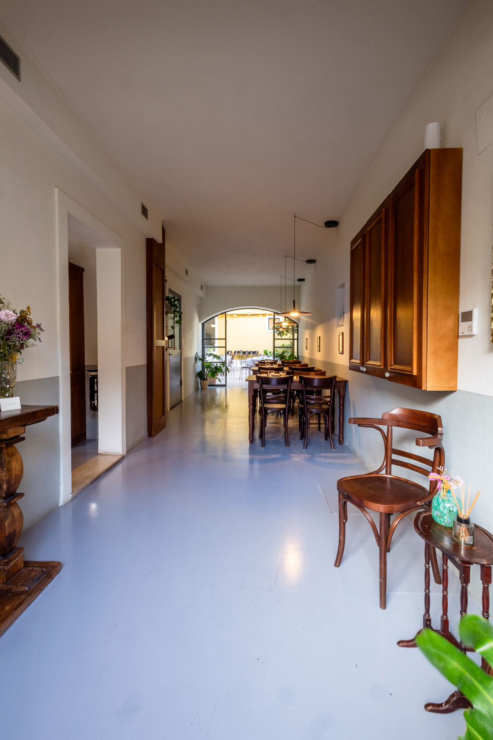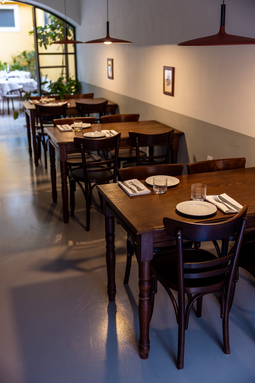 On Salaminos Street in Kerameikos, where neoclassical Athens meets contemporary life, Circus Design Studio has crafted Osteria Mamma, an intimate Italian restaurant that feels like a family home. Behind an iron gate reminiscent of Bologna or Genoa, a narrow corridor unfolds with a few simple tables, setting a tone of quiet familiarity. The design draws from domestic warmth and everyday authenticity, translating them into a setting that invites comfort and connection. An interior window offers a glimpse into the chef’s table and the open kitchen beyond, tiled with hand-painted ceramics of lemon trees in bloom. Facing the pedestrian street, the kitchen becomes a stage, connecting the restaurant to the neighborhood through the sights and aromas of cooking. The space extends across two levels, centering around a semi-open courtyard under a glass roof that diffuses soft natural light. Ochre-painted walls, white tablecloths, and a vintage sideboard filled with wine bottles and porcelain create an atmosphere that feels timeless. A marble sink filled with empty bottles stands as a sculptural reminder of shared moments and convivial nights. Materials shift between rustic and refined — old tiles, wood, marble, and iron coexist in an elegant, unforced balance. Lighting plays a key role: low sconces and hanging garlands create a glow that turns candlelit in the evening, evoking the charm of an old Italian home. For Circus Design Studio, Osteria Mamma is a space where every detail, from texture to tone, serves the feeling of being welcomed.