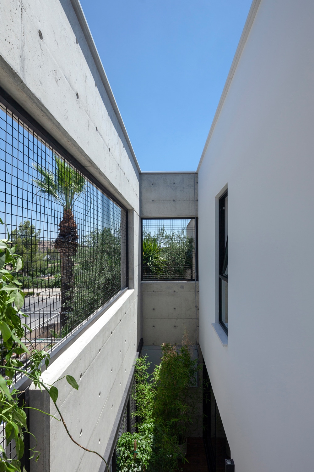As the architect describes, the successful interplay between the blank and structured parts of the wall purposefully controls the passage of light inside the house and offers levels of privacy and security, cross ventilation, and a variety of optical escapes. An open dialogue is developed between the building and the existing urban landscape that offers a vast range of spatial and visual conditions. Small courtyards and terraces are generated between the main building and the vertical wall, where the house’s main spaces are extended. The interiors are organized in relation to the vertical wall and a courtyard that enters from the back of the ground level to end up in the center of the house. At the core of the house, mass was removed from the volume of the building by vertically carving it. In this way, visual communication between the two floors, provision of abundant daylight, and framing of the sky are achieved. In the center of this blank space, a mastic tree is planted, framed by a circular seating surface transforming it into a vital place for gathering and communication between family members. As in the rest of the outdoor spaces, the void is filled with metal surfaces allowing natural vegetation to climb. Cypriot plants such as jasmine, honeysuckle, and pandorea have been carefully preserved or transplanted in all outdoor spaces. The refreshing nature enters the house and climbs upon its skin in an everyday life that embraces the garden and turns towards it.