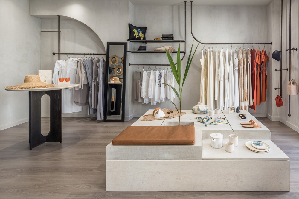 The selection of earth toned colours and the textural richness of natural materials like mortar, wood and marble are prevalent in the design, contrasting the metal details on display stands, clothes rack and lighting fixtures. The monolithic marble volumes scattered in the oblong space and the bespoke lighting enhance the almost primitive aesthetic.
