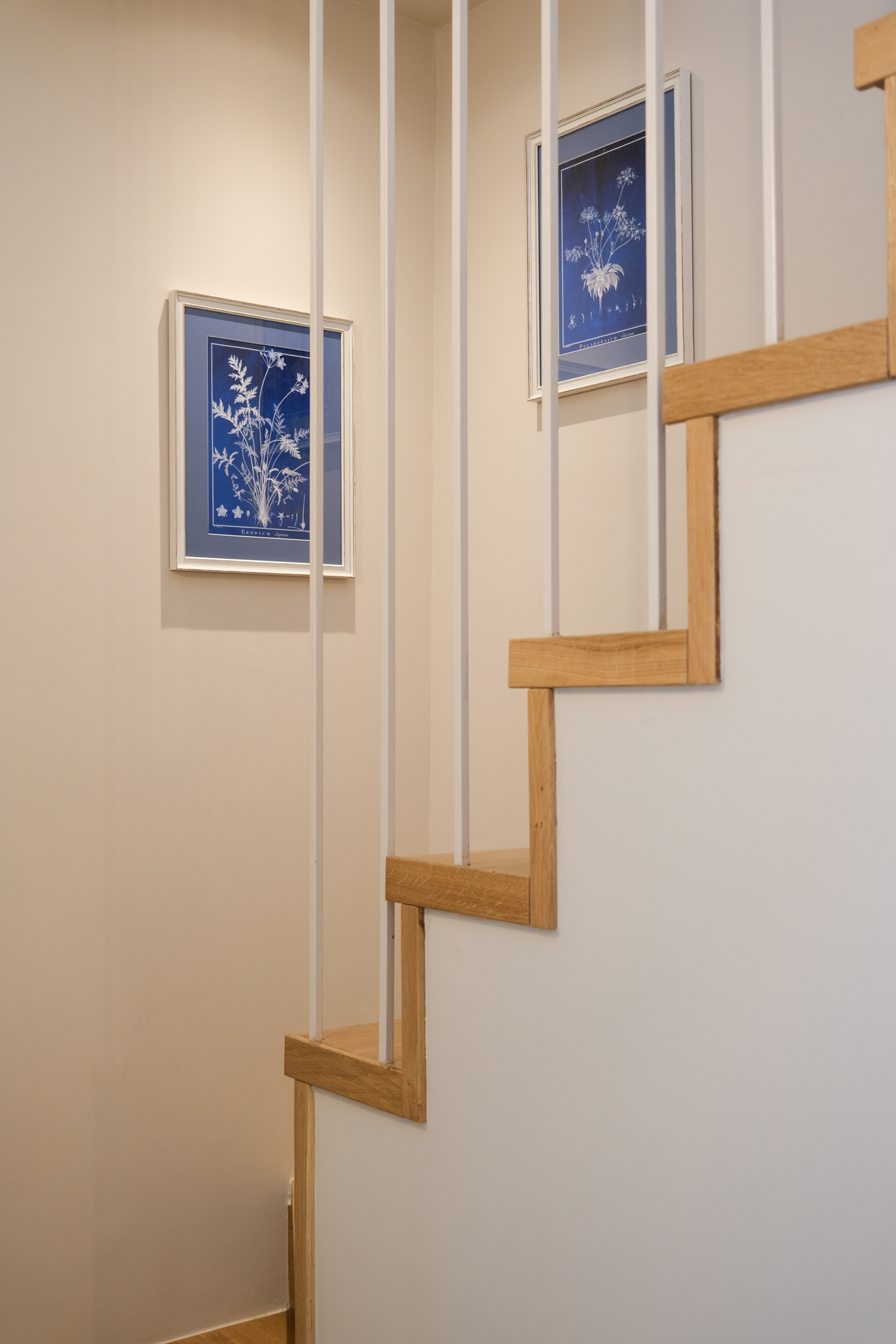 Staircase connecting old stone base with new extension above