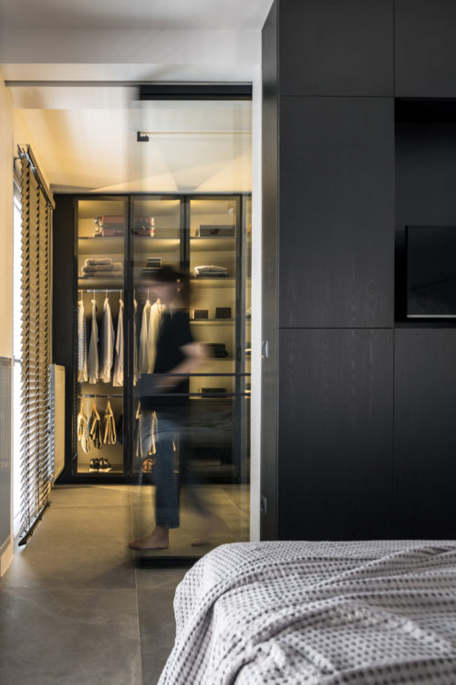 The apartment has a master bedroom which communicates with the dressing room and the ensuite bathroom via a metal sliding door. Black melamine is the main material for the wood paneling and the furniture, while the rest of the walls were coated with Kurasanit mortar. The kitchen island is a custom made construction from stainless steel sheets, giving a more industrial style to the space. The bathrooms follow the same design aesthetic with tinted mirrors, metallic black details and tiles in shades of gray and black.