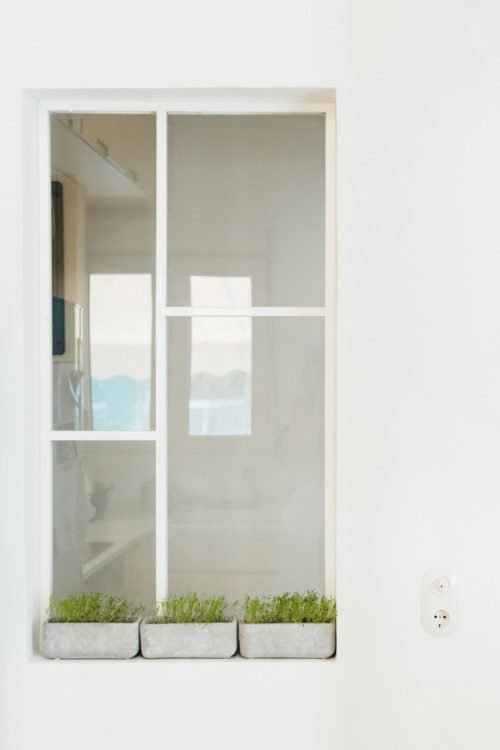 A search for an honesty of materials and textures led to simple non-expensive solutions. Plywood is used throughout in its natural colour with routed joinery details, whereas the bathroom is covered with simple white tiles. The kitchen’s countertop and backsplash are made out of Dionysus marble, locally sourced 20 km from the site. We enjoy the conversation that happens between the 50 year old sink and the newly cut countertop; the marbles are from the same quarry, yet years apart. Additionally, the old weathered countertop has been repurposed as a desk surface in the guest bedroom. The only colour used throughout the house is shades of blue to reflect the flat’s views of the sea and sky and can be found in the dividing floor tiles and bathroom’s grout.
