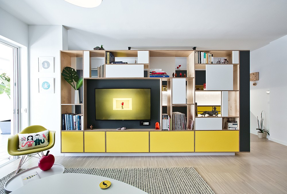 The materials used in both are plywood for the structural parts, and lacquered mdf wood for the mobile parts. The colors of the lacquered parts (white, dark grey & yellow) complete and strengthen the playful character of the design, while the shown edges of the plywood punctuate its form. The floor of the whole area is covered by a single material to highlight the continuity of all functions. The industrial wood floor is selected to stress the concept of the design.