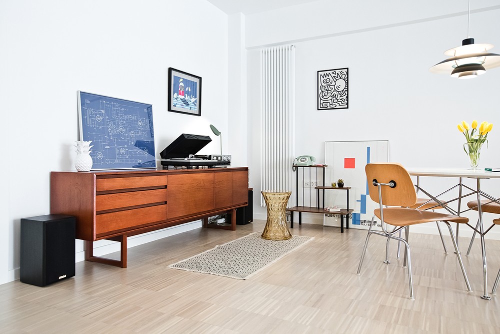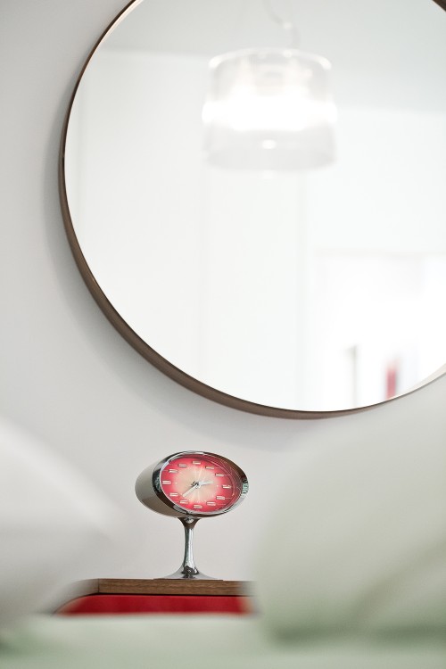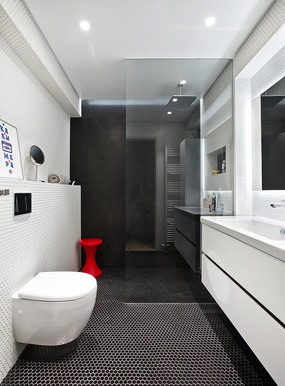 The design of the bathroom follows as well the concept of the open-space. The shower is separated from the rest of the facilities with a glass, so the first impression is a continuous space, emphasized by the use of only one material that covers both walls and floor. The black & white color combination creates an illusion of a bigger area, while keeping the minimal tone. The interior design of the flat is then completed by the mixed use of vintage and new pieces, each one of those carefully chosen in order to maintain a modern, simple style.