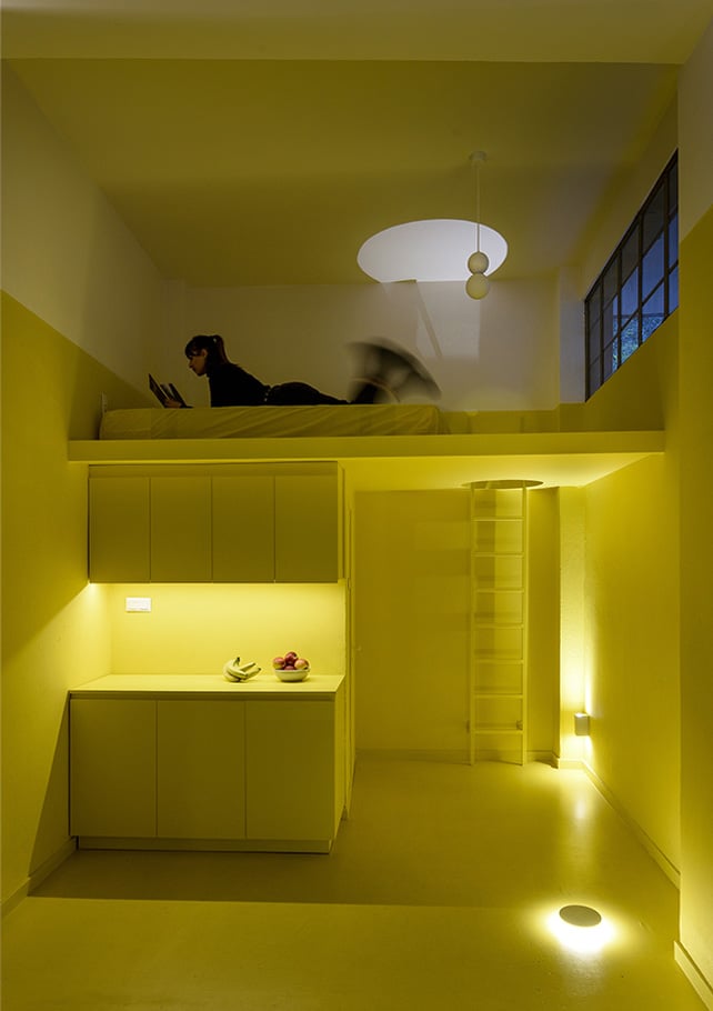 The main workspace, elevated in a prominent wooden “box”, gives shape and separates the axes of movement and the additional/ancillary places for work – meetings, while at the same time, it incorporates the individual secondary uses into the underlying storage space. A yellow stroke (folie Jaune) creates a cinematic scenery of a micro-residence (kitchen, bathroom, bed). The interaction between the user and the lighting suggests the size and tension of shadows, constantly transforming the images received by the observer, who discovers every time a different connecting link between the perpetual symmetry of shapes and light, through the changing points of view.