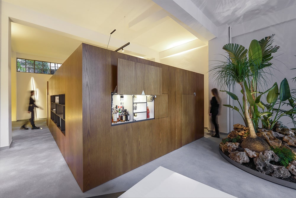 A circular surface with tropical plants (Strelitzia Nicolai, Howea forsteriana, Beaucarnea, Asparagus setaceus) and natural stones are placed at the entrance of the office. A fully automated irrigation system with drippers and artificial lighting devices of appropriate wavelength ensures the optimal conditions for the maintenance and growth of the plants. A sense of cooling, due to the phenomenon of evapotranspiration, as well as the petrichor – the scent emerging from the moist soil – acts and makes the users feel “as if” they were somewhere in nature.