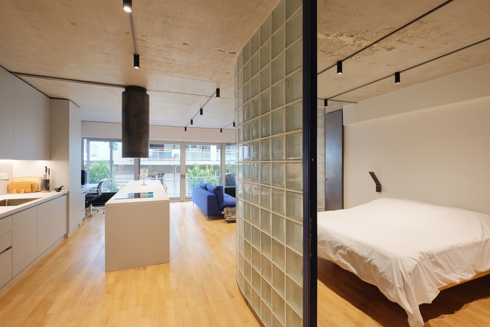 Located in a 1970s apartment complex in the Korydallos neighborhood, this 60 m² studio was originally designed for professional use. Aphe Architecture Studio has reimagined the space to serve both living and working functions, offering a modern, urban approach to daily life. The layout is divided into two zones. Upon entering, the kitchen and bathroom are positioned together, with the kitchen island acting as both a functional and social space at the core of the studio. The living room and bedroom occupy the second zone, with a curved design that ensures a smooth flow throughout the space, creating an open and cohesive atmosphere. The bedroom is separated from the living area by a wall of glass bricks, which allows natural light to filter through while maintaining a sense of separation. A metal panel at the edge of the glass bricks offers flexibility, enabling the resident to control light and ventilation. This thoughtful use of materials helps create a dynamic interplay between light and shadow, adding depth and richness to the space. Exposed cement construction, combined with ambient lighting from metal tube spotlights, enhances the industrial feel of the studio. The design incorporates metal elements in the furniture mounts and clothing hangers, reinforcing the modern aesthetic. A deep blue door connecting the daily living spaces to the private room serves as a striking design feature that integrates seamlessly with the overall concept.