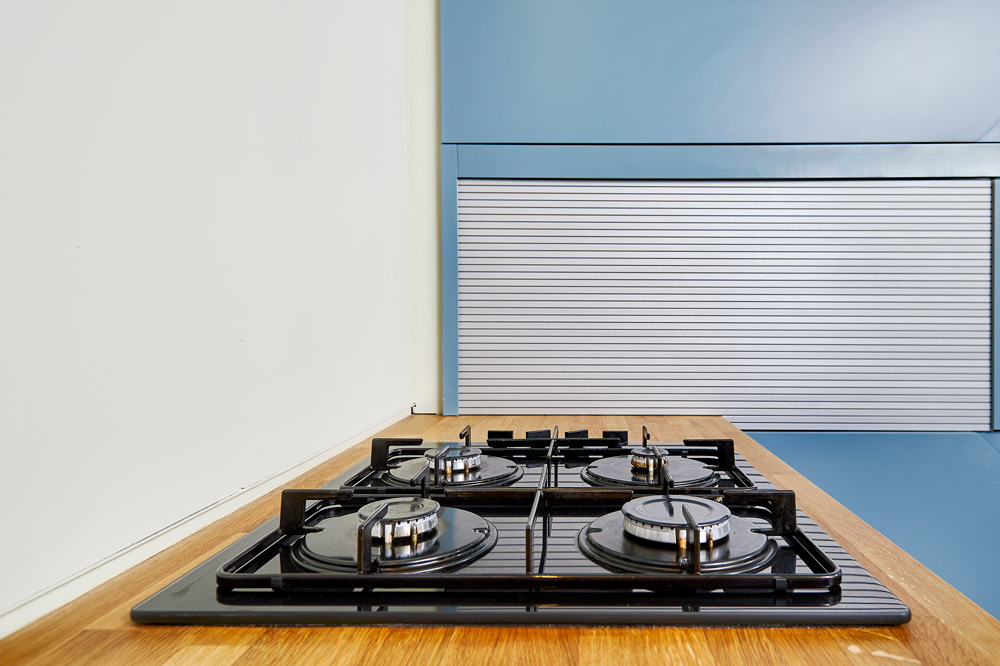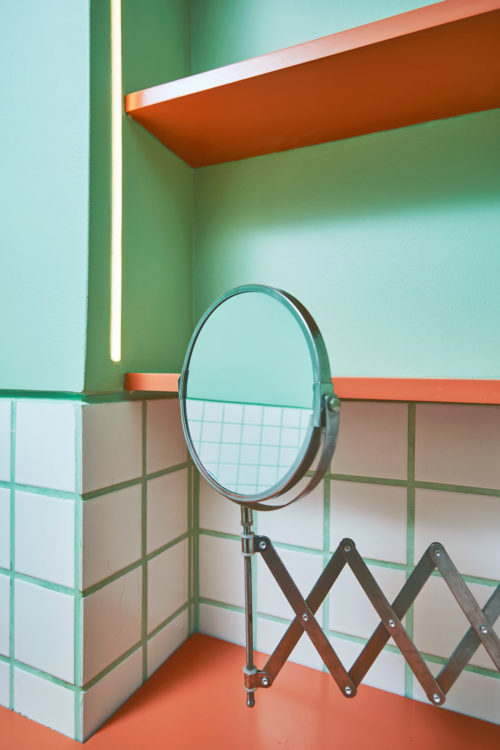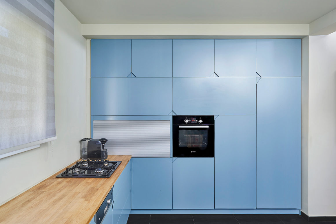 Shades of blue, pistachio green and a hard-to-miss vivid orange accented with blacks and whites, clean geometric lines and circles create a playful as well as delineate space. Geometrical interest is added in the bathroom by the grid of square 10*10 white ceramic tiles. Surfaces are painted with pistachio green tone which is also found to the joints of the square tiles, creating a sense of fluidity in the space. The custom made rectangle sink painted in vibrant glossy orange- and shelves painted with the same color, add a bold splash of color to the scenery. Round mirrors, square tiles, linear folding lights – every element adds to the emphatically geometrical identity of the space. In the kitchen perforated black tiles on the floor accent to contrast with powder-blue painted cabinets, which were custom made for the project. Wooden surfaces in the kitchen enrich the canvas of natural materials. Avoiding cold, shiny surfaces the kitchen is a comfortable space that the family spends most of its time in. The tringle handles add to the sense of refinement and craftsmanship, as well as the detailing of the design. The colorful interior in combination with the geometrical language aims to create a devising optimistic environment that glisten with energy, playfulness and enthusiasm.