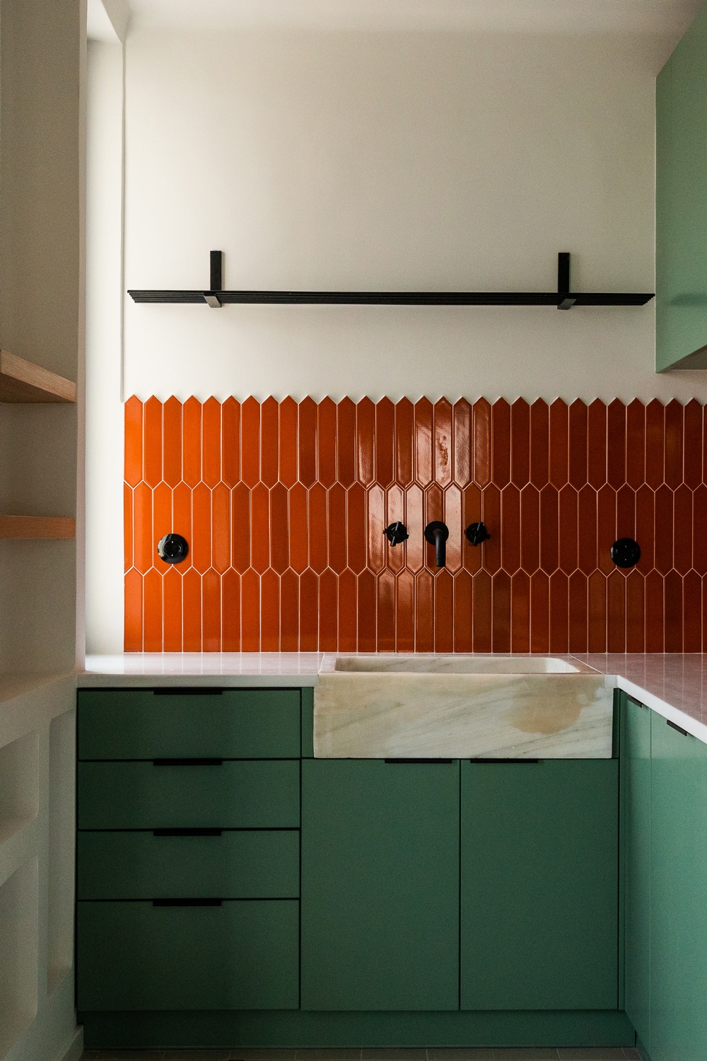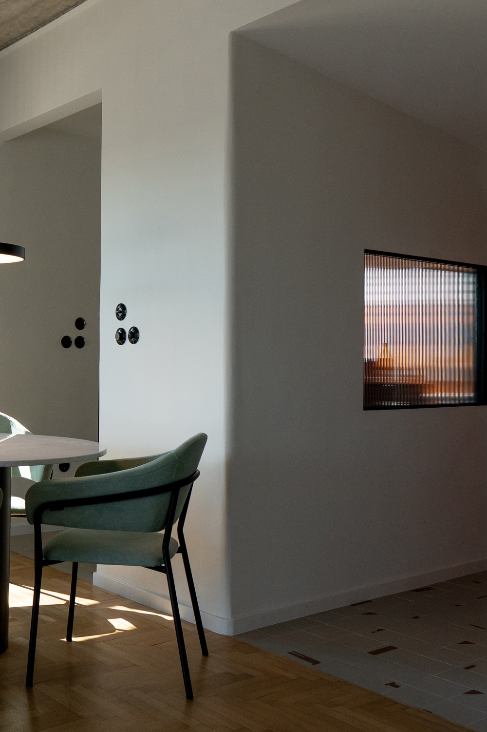 Exposed concrete ceilings, revived wooden floors, marble sinks, and curved details are combined with metal structures, wooden surfaces, natural materials, various qualities of glasses, and handmade coatings –in a constant dialogue between the existing and contemporary elements. Diverse aesthetics derived from different decades are combined to achieve a distinctive, yet minimalist intervention.