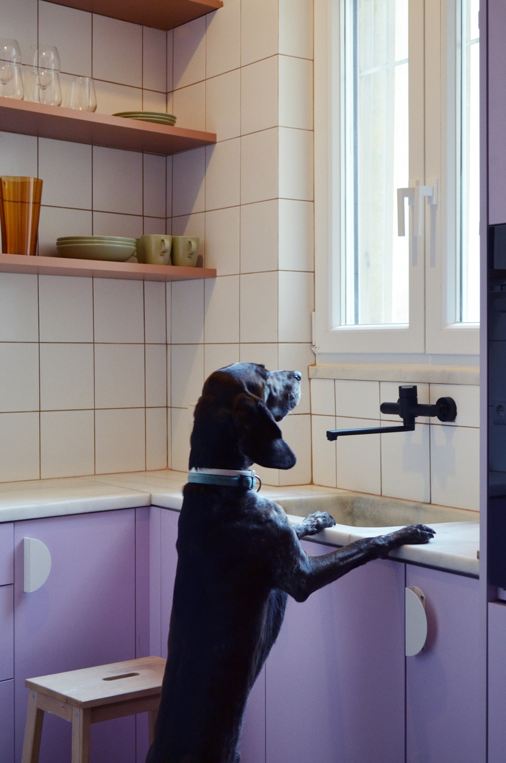 As the architects describe, “an entrance functioning as a filter and threshold for this 95sqm apartment guides the user to a dining/working space that is merged with a living/library space through timeless, yet functional sliding wooden-glass doors”. A second hall connects private and communal areas with the restroom and the kitchen. The apartment features bespoke furniture, focusing on the preservation of the space’s original values in a flexible and respectful way. The original countertop and sink made of Dionysou marble in the kitchen have been kept intact, developing the whole food preparation area around it. Desaturated orange and lilac colours have been used for the kitchen cabinets and table tops. A curvy custom table has revived a dark corner of the space smoothing out the acute angles of the kitchen. The same shape has been used on a smaller scale on some shelves and in the add-on handles. The restroom was completely renovated with new-built short wall dividers and a counter covered in a minimal white tile reminiscent of the 70s small-size square tiles, complemented with a desat orange seam matching the hall mosaic.