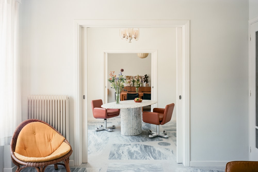 With a vision to create a space that encapsulates the old-world glamour of Athens, Molonglo designed a humble, yet characterful apartment in the Kypseli area in collaboration with Royffe Flynn architects. The 1950s apartment is located on the third floor of a six-storey polykatoikia, featuring a charming, mirrored entrance with marble steps, on a prominent corner at the intersection of Troias and Drosopoulou streets. The renovation completely rethought the apartment’s design while preserving its authentic identity. “Troias” consists of two bedrooms, two bathrooms, a kitchen, a living area, and a workspace. Large French doors and three independent balconies let the light and air circulate throughout the space. The apartment’s original layout has been retained, along with most parts of the kitchen such as its cabinets, joinery, and the compact functionality of a series of countertops at varying heights. The team focused on celebrating the world of makers, utilizing different forms of craftsmanship to foster the space. Flooring is made of a large-format terrazzo set within a series of rectangular, circular, and semicircular slabs. Mined 16 kilometers northeast of the city, the slabs were cut without waste, and the offcuts were broken up and used elsewhere in the apartment. Reclaimed pieces have been collected from Athens’s many marble yards to make the sinks, steps, and paneling. Objects and furniture carry a long history of crafts from the 1950s to the 70s, as a wealth of international materials spanning the best part of the twentieth century are used: Czech glass, Italian marble, Danish bamboo, Swiss leather, and American lucite, velvet and brass. The furniture includes bedheads made by local carpenters working from a nearby apartment, and lamps were sourced from the original lobby and hotel rooms of Athens Hilton.