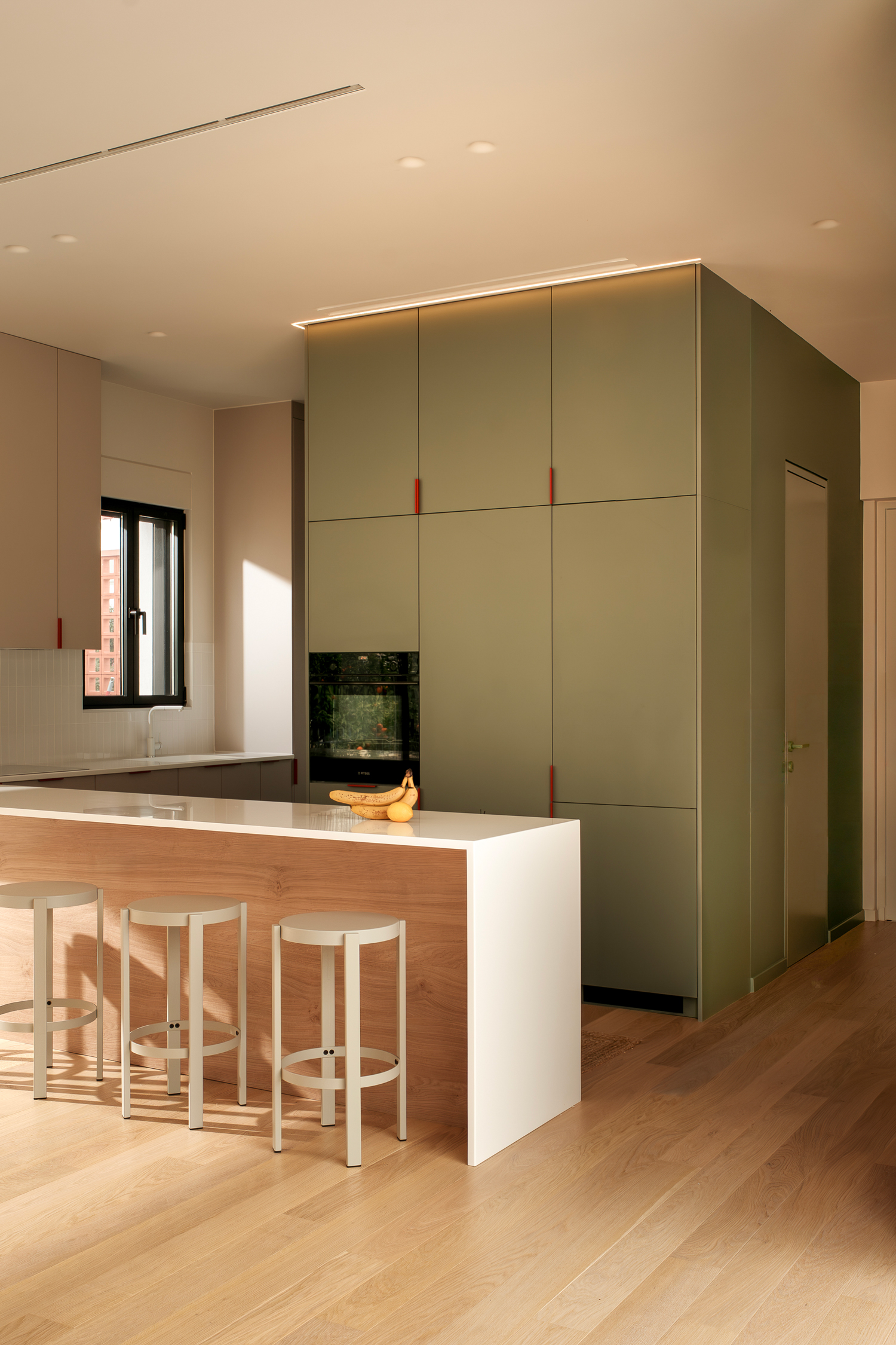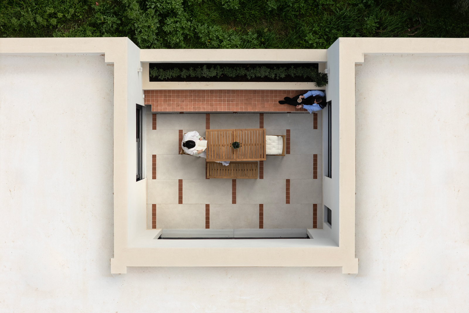 Interwoven Voids is a single-storey house in Patras designed by Di Architecture Studio. The 120-square-metre home sits on a long and narrow plot, shaped by neighboring buildings to the north and west and a street-facing orientation. Instead of forming a compact enclosed volume, the architects organized the house around a sequence of small courtyards that draw daylight deep into the plan while preserving privacy. These voids interlace with the built fabric, creating a layered relationship between interior and exterior spaces. Openings, visual axes and screened thresholds establish continuity throughout the house, with claustra elements softly filtering views between public and private areas. Windows are treated as inhabitable elements, from low sills that double as seating to tall recessed doors that extend living spaces outdoors. The plan is divided into a central living zone and a more compact bedroom wing, with an open-plan kitchen, dining and living area forming the core of the house and opening onto patios oriented to different light conditions. Designed for a young couple and their cats, the interior incorporates built-in furniture, perches and shelves that encourage movement and observation. A restrained palette of oak and white walls is enriched with carefully placed color accents, while the exterior combines terracotta tiles, pale stone slabs and planting to echo the interior’s rhythm and balance openness with retreat.