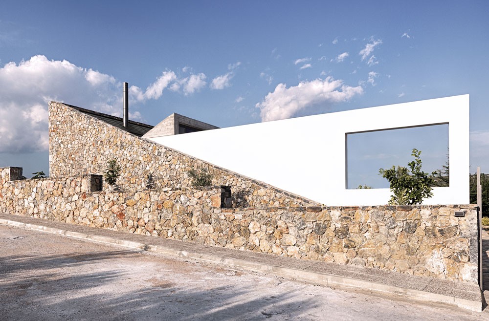 The design of this summer house in Aliveri, a region near Athens, can be summarized in 2 key words: “Outdoor Living”, as architect Natalia Kokosalaki focused on creating outdoor spaces as private as possible, with the interiors being open towards them and towards the sea. Hence, the outdoor spaces, the swimming pool, the bbq area and the vegetables garden are the driving forces for a type of indoor living that is compact, versatile and simple. The design concept was based on using the protection from external conditions provided by the compact monolithic volume, but shaping it internally to create niches that act as shaded inhabitable areas, offering at the same time a 180-degree view towards the sea. The design aimed at creating something beautiful, introvert and distinctive from its surroundings, which nevertheless keeps costs down, in a value for money sense. A key challenge in the interior layout of this house was to maintain the potential for future expansions, by also meeting the programmatic requirements of the brief. The layout breaks down into two main zones: roughly three quarters of the floor incorporate a master bedroom, bathroom, compact kitchen, dining and living, with the remainder of the plan left open so that new spaces could later be incorporated to the house. The defining feature of the construction is the wall, whose stone was excavated directly from the site and formed in-situ from local manufacturers. Finally, roof photovoltaics and water collector tanks were installed, significantly reducing the building’s environmental footprint.