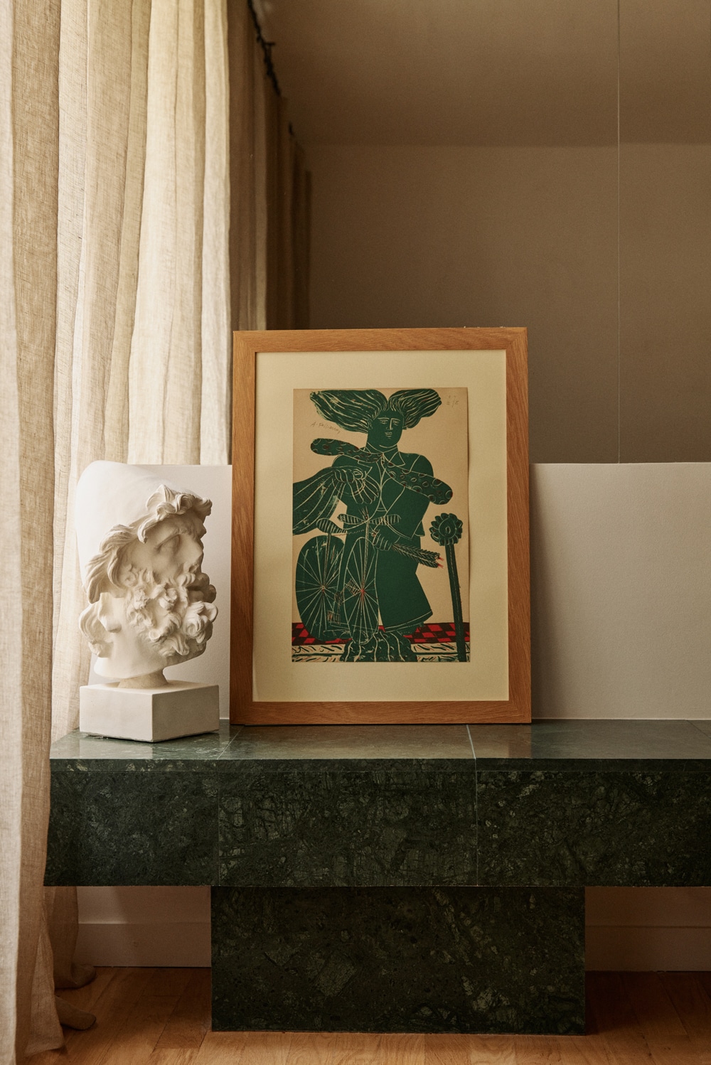 Located in the heart of Paris’s 2nd arrondissement, this 1940s apartment is a study in timeless design, merging artisanal craftsmanship with contemporary elegance. The renovation, led by Stene Alexopoulos, draws inspiration from Italian architect Carlo Scarpa, whose mastery of materiality and spatial composition influenced every detail of the transformation. The apartment’s chromatic palette is an ode to natural materials, where rich walnut wood, deep green Indian marble, smooth concrete, and solid oak parquet define the atmosphere. A striking feature of the interior is a bespoke concrete table cast on-site with an inset of green marble. This is echoed throughout the space with other handcrafted elements such as the sculpted basin and custom-built bench, all prototypes tailored specifically to this residence. The furnishings reflect a curated balance of vintage and contemporary pieces. Handcrafted chairs from the island of Skyros sit alongside iconic mid-century designs like Eames chairs, while vintage Grundig spherical speakers add a nod to the past. A painting by Fassianos anchors the space while a luxurious Roche Bobois sofa introduces a touch of comfort and modernity. This renovation offers a perfect balance of craftsmanship, history, and modern living, honoring the building’s 1940s character while creating a contemporary home.