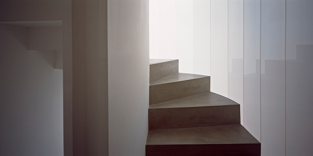 The surrounding landscape is characterized by dry stone retaining walls, transforming a steep topography into a stepped series of arable strips. These long walls have been the most prominent man-made intervention in this harsh landscape for centuries. The new tower house contemplates exactly this: a mass among the existing preserved retaining walls and a few new concrete ones. There are no seams in the white, stucco facades, only the dark frames of the windows. No features project from the main volume, except the steel frame in front of the main view, which accommodates temporary screens.