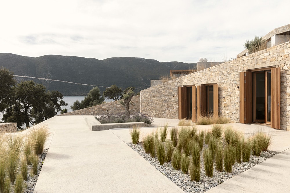 Block722 architects were called to create a private holiday home, joined by a separate structure that houses four guest rooms. The plot is located on a cliffside overlooking the blue waters of the Ionian Sea. Entering the site from the topmost side, visitors are guided down to the main house via a wide ramp. From there, a series of paved terraces and a narrow, natural path lead to a small, secluded rocky beach below.