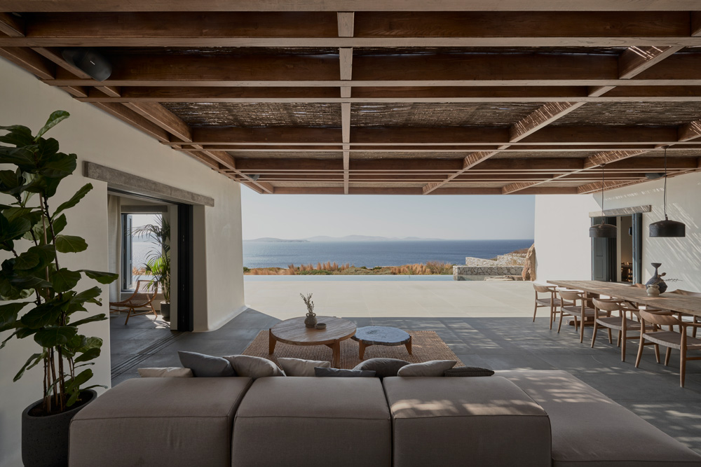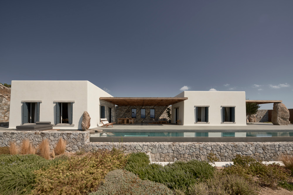 The simple white volumes, straight stone walls and light pergola planes sit comfortably in the Cycladic landscape and the efficiency of their layout, centred around the courtyard living space, streamlines daily life. Villa Mandra is informed by humble Cycladic tradition, enriched by natural materiality and inspired by contemporary summer living.