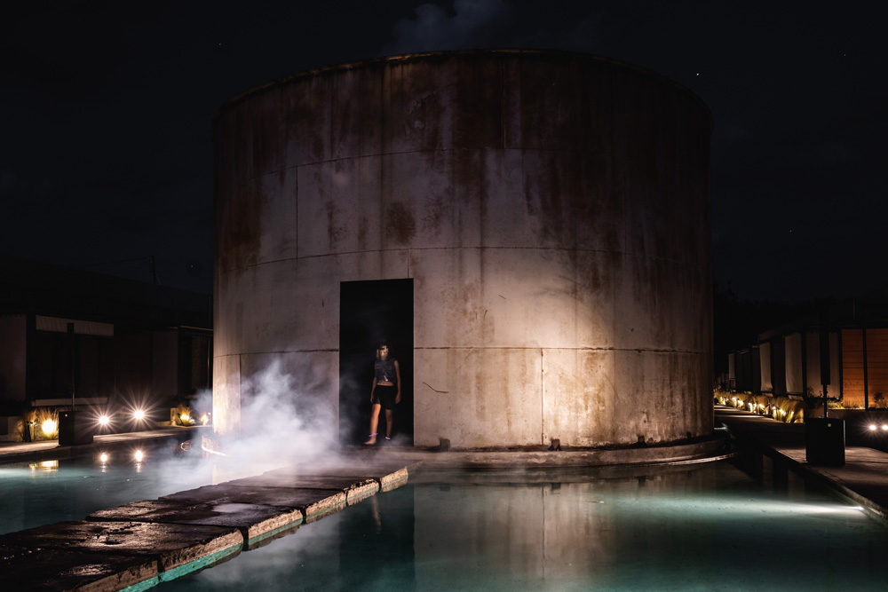 Throughout the performance, Panos Profitis and Despina Charitonidi use their bodies either as a unity or in a binary, complementary way. Their movements, anchored in stillness, balance or endurance, and complimented by GHONE’s soundscapes, form delicate, sometimes playful, tableaux-vivants set against the metal carapace of the hotel’s signature tanks.