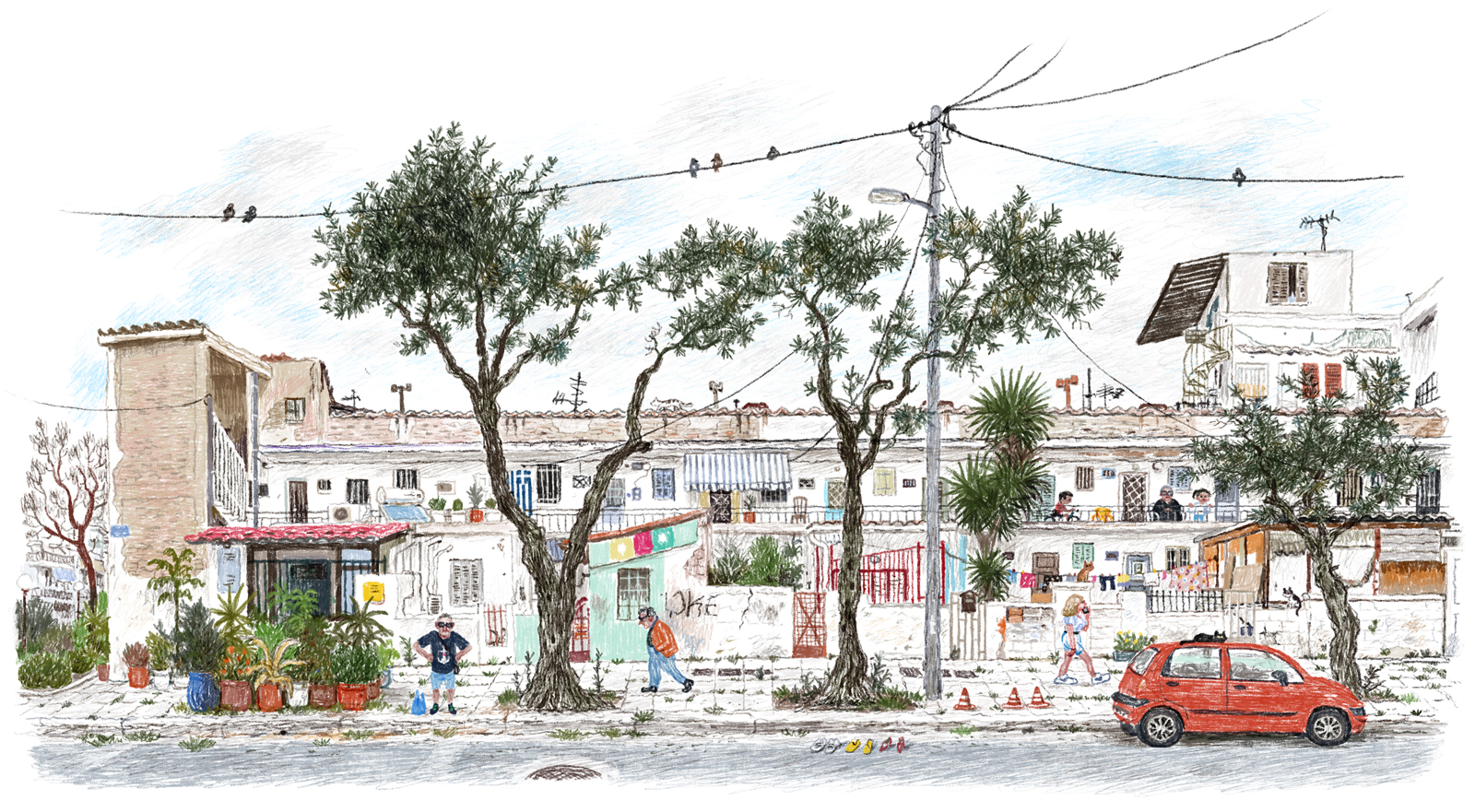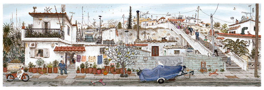French artist Nicolas Hubesch divides his time between Paris and Athens, a rhythm that fuels his curiosity and sense of place. In the Greek capital, his gaze turns away from landmarks toward the ordinary — quiet streets, faded façades, empty lots. Working from long walks and photographs, Hubesch reconstructs moments of observation through drawing. His compositions often stretch wide and frontal, offering panoramic views that invite the eye to drift slowly across the page.