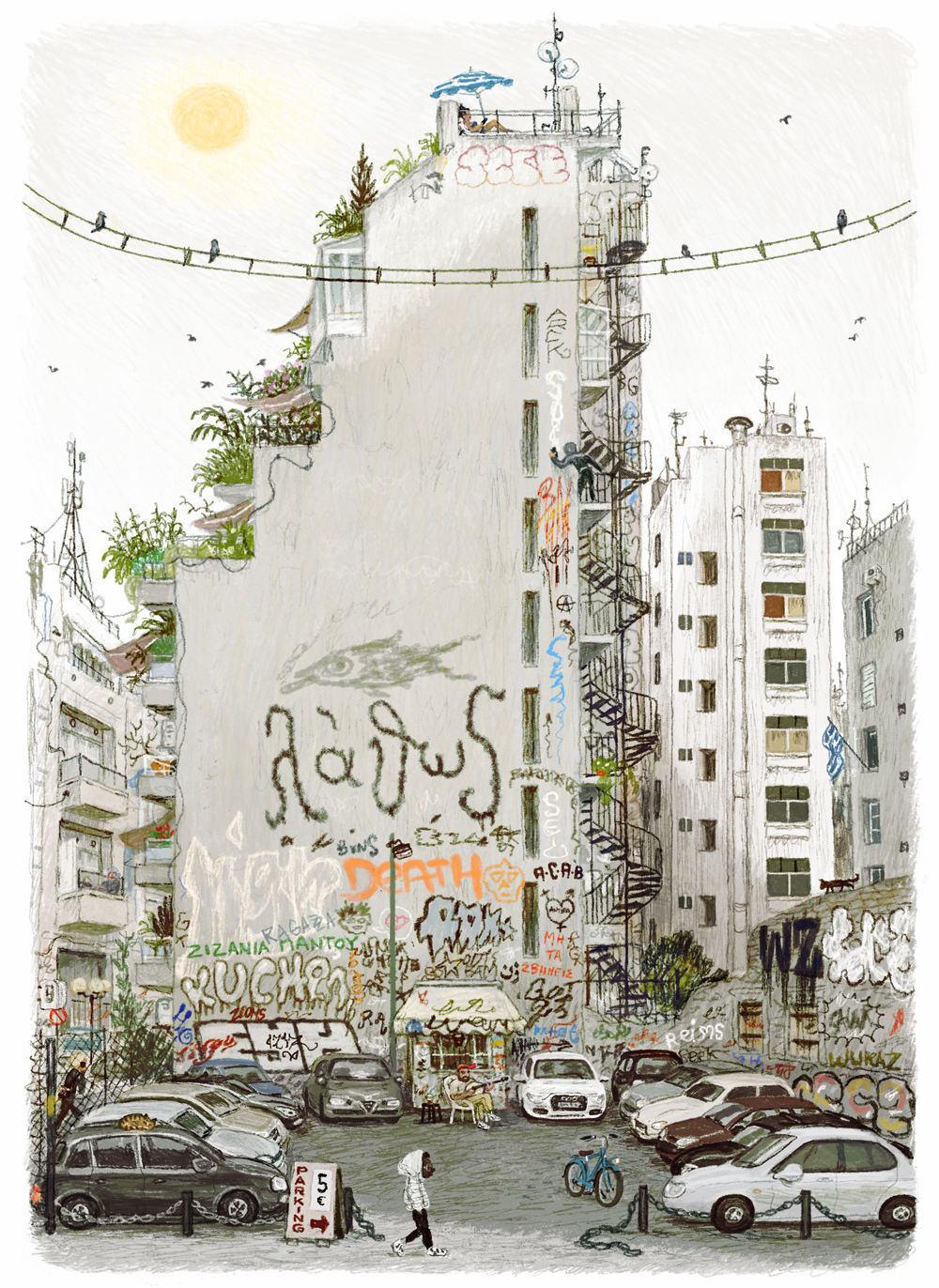 Among crumbling refugee houses, old cafés and restless construction sites, Hubesch finds a fragile equilibrium. His drawings capture a city suspended between disappearance and renewal, where gentleness persists amid the hum of urban change.