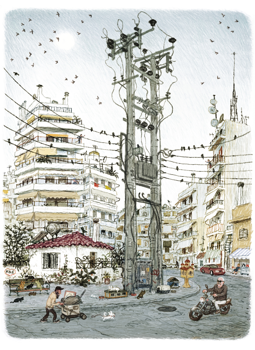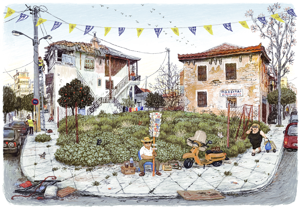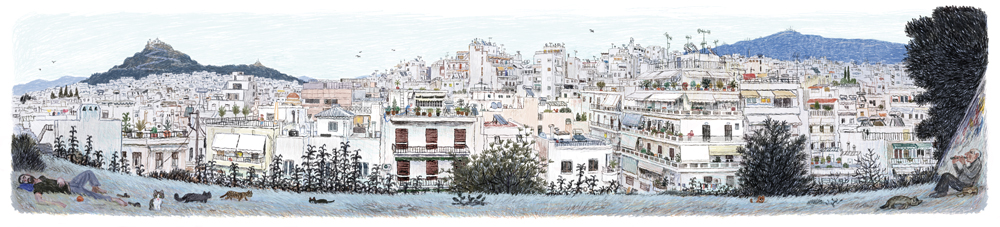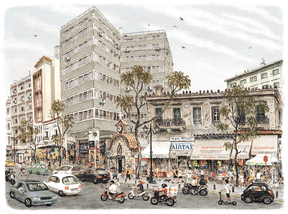 Reality in his work is filtered through memory. Buildings shift, details rearrange, and perspectives merge as he reinterprets the city’s fleeting atmosphere. The result is a delicate tension between documentation and emotion, an image that reflects Athens in constant transformation.