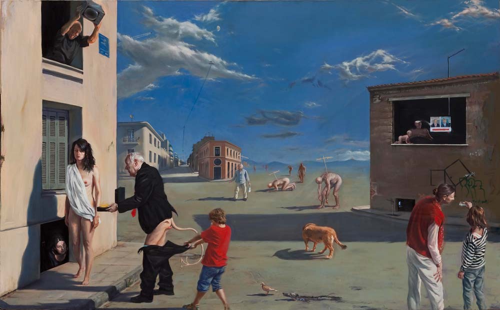 Adrianos Sotiris, a romantic in an anti-romantic age, is a painter of a gifted generation who lays claim to the lost (?) honor of painting and re-negotiates its position in History as well as in a culture which has learnt to consume simulacra instead of creating values or formulating interpretations. Barthes, again, considered the unilaterally representational, the realistic element vulgar precisely because of its obviousness – because what counts in art is first and foremost mystery. (Here speaks the adept and magus of the image De Chirico.) This mystery, this surfacing of a spectral universe in which dream and nightmare interweave, is the basic characteristic of the poetics of Adrianos.