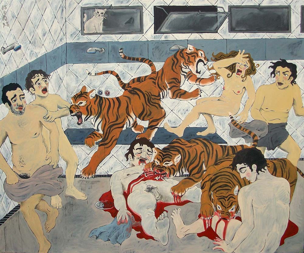“What I want in a work of art is realism, not only in the way of painting it, but also the act of painting itself, to render the theme and the narration realistic. In order for this to happen, I have to be objective with my theme and cold in my emotions, so as to use them as tools, as well. In order to achieve that, my point of view has to be that of a director, an actor, to be theatrical. Thus, when making my drafts in order to give a form to my composition, the most important factor is the chemistry between the viewers and the reality of the nature of my painting.