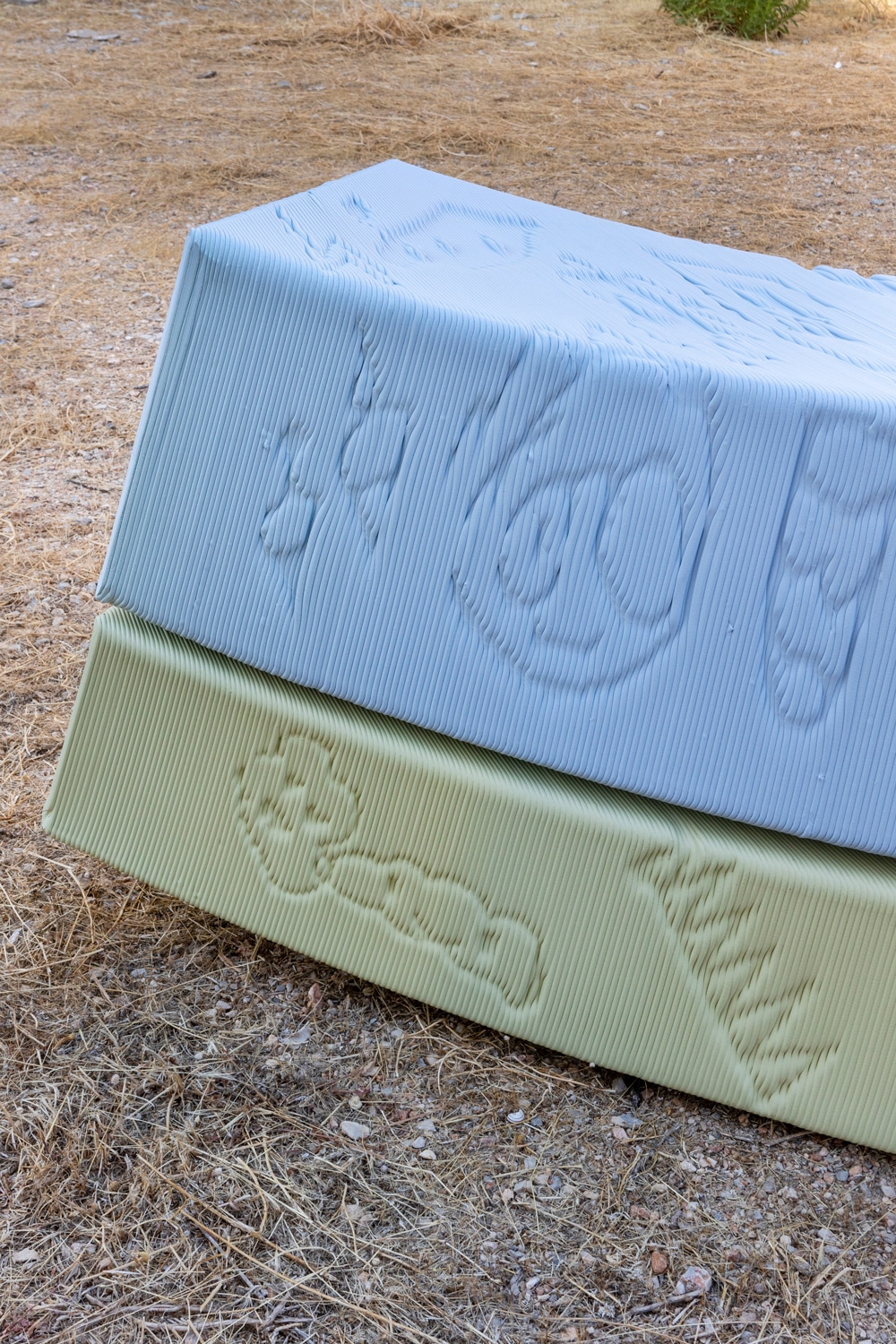 Following an educational tour based on a pragmatic approach and exploring ways to recycle discarded plastic, local children were heavily involved in the design process and were invited to create drawings, which were later scanned, digitally processed, and engraved on the new furniture. The name of the collection, which comes from the Greek word γλυφή (carving), refers to ornamental engravings of messages or symbols on ancient temples.