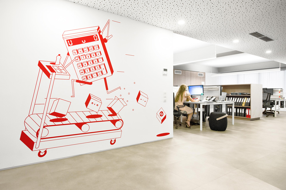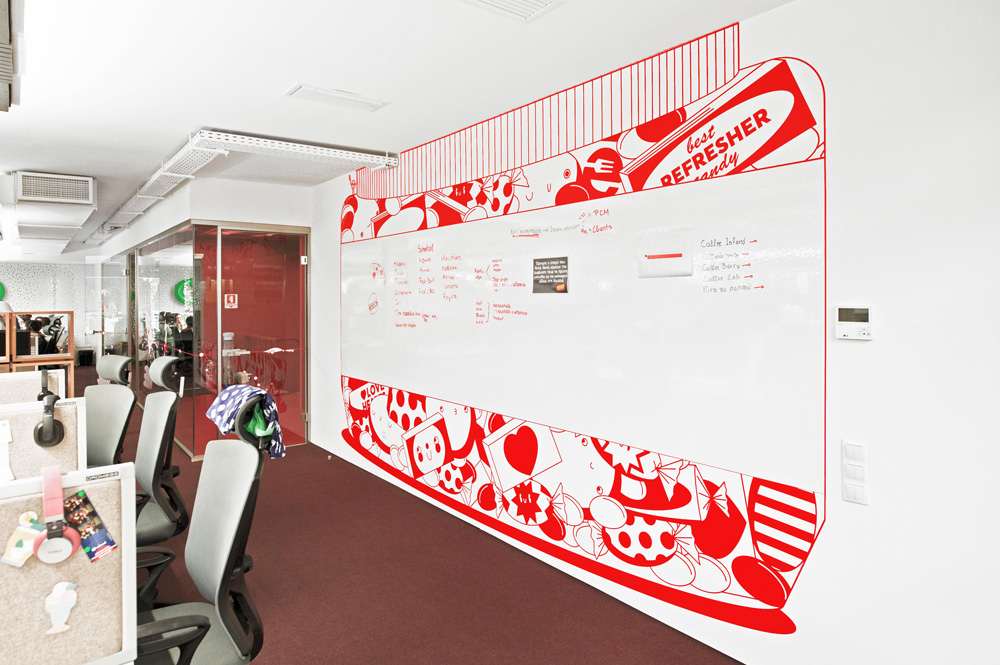 The lobby, the restaurant, the finance department and the call centre are just few examples that worked as a reference for the ‘foodie’ characters to be born. The illustrations reflect the energy and the values of efood with a nerdy sense of humour, inspired from the Social Media and other sources like: technology, hype culture, food, pop culture and human traits. Many hidden and tiny images can be found around the place and specific characters often appear more then once in different actions. This way the graphics almost become a version of an experimental modern comic.