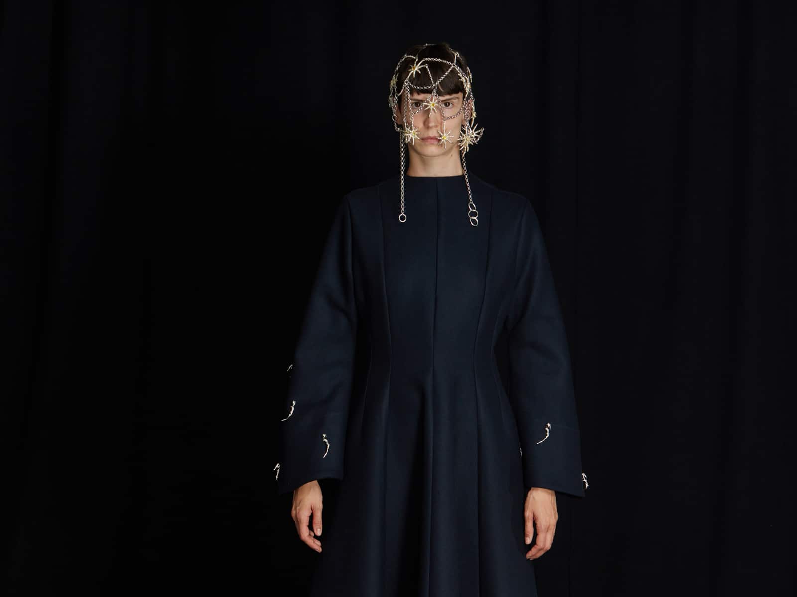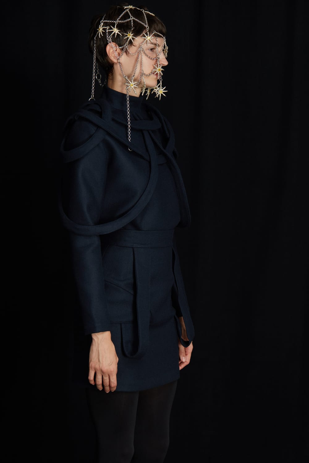 Sculptural elements embrace the upper body, drawing from Gothic-inspired art. Circular fabric patterns mirror the sandstone of Maria Island, adding flair to cropped tops and tailored jackets. Linear panels, inspired by bold sketches, elongate silhouettes seamlessly. The “Platypus” blouse introduces bell-shaped sleeves, while dresses and coats boast dramatic lengths. Geometric cutouts in dresses like “Australian Little Penguin” and “Cave Spider” pay homage to Tasmania’s architecture, strategically revealing skin. The “Common Wombat” skirt nods to indigenous Australians’ face painting techniques. The palette, inspired by Tasmania’s diverse animals, features deep blues, petrol hues, soft browns, and classic black. Luxurious fabrics ensure warmth without sacrificing style. Teaming up with SANKTOLEONO, silver accessories inspired by plankton shapes add a bioluminescent allure to selected pieces, creating a luminous charm. 2WO+1NE=2’s collection is a tribute to Tasmania’s wonders, offering a blend of nature, culture and sophistication.