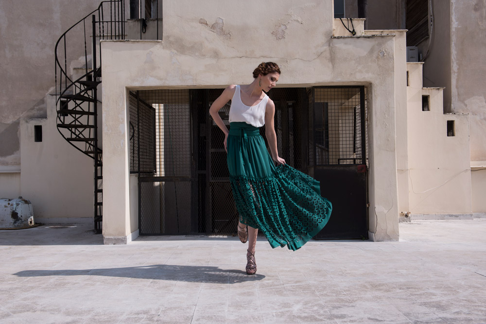 For Myrto Dramountani, fashion and architecture have a lot in common, as we make clothes for the same reason that we build a house: we seek shelter through the use of geometric designs. Both our clothes and the spaces that we live in offer protection, generate feelings and need us in order to be used. Hence, for Myrto Dramountani – a Fashion Designer and Architect herself – the process by which a dress is made can be defined using metaphors of architectural construction. Fashion design and architecture share many similar techniques and even vocabulary: pinning, darting, folding, wrapping, draping, and cutting. Therefore, her designs are always influenced from architecture – she even uses architectural design software in order to create them. Her goal is to cover, but also to reveal the body in a structural way.