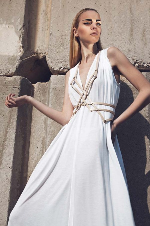 Figures and frames drawn from art-deco, modern art and astronomy are shuffled and reordered to reflect the style of iconic characters of the Greek mythology. The designs attempt to symbolize the strength and the dynamics of mythological creatures, men, gods and warriors such as Minotaur, Persephone, Achilles, Athena, Hermes, Medea, Icarus. They emote the internal fight between light and erevos, flight and fall, life and death and the final symbiosis of all in their dramatic characters. Therefore LINEAR_A consists of two parts. The dark and mysterious one, in which the black leather stripes connect through rusty black nickel studs and the light and graceful one, in which the nude beige blends with gold brass features. As its name suggests, LINEAR_A speaks through a primal, original language based on strict lines and familiar geometric shapes without volume, similar to the scratches of the letters on the Phaistos disk. Faithful to leather as the fundamental element of the brand, Aumorfia uses it in the most minimal and fine way in an effort to highlight the most elegant and sophisticated side of this timeless and lively material. Feminine or masculine, all pieces of this collection adopt the personality of their owner, manipulate the movement of fabrics, transforming all garments โ whether a pareo, a t-shirt or a dress – into statement outfits that release the inner god/goddess of its wearers.