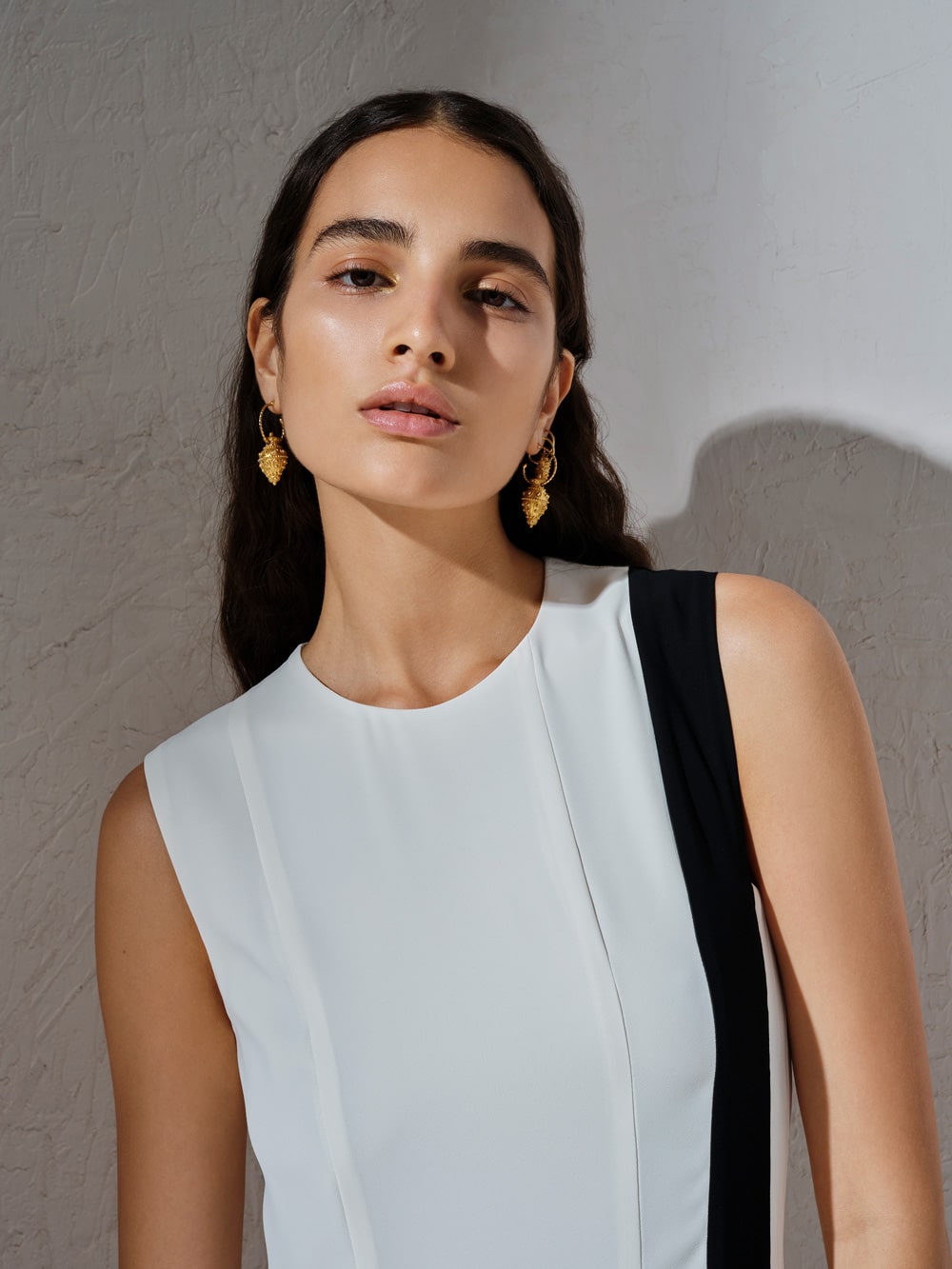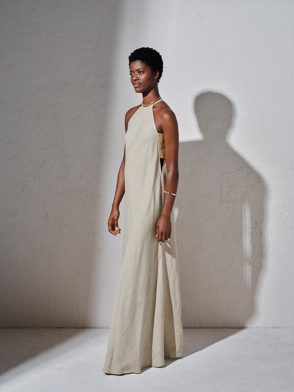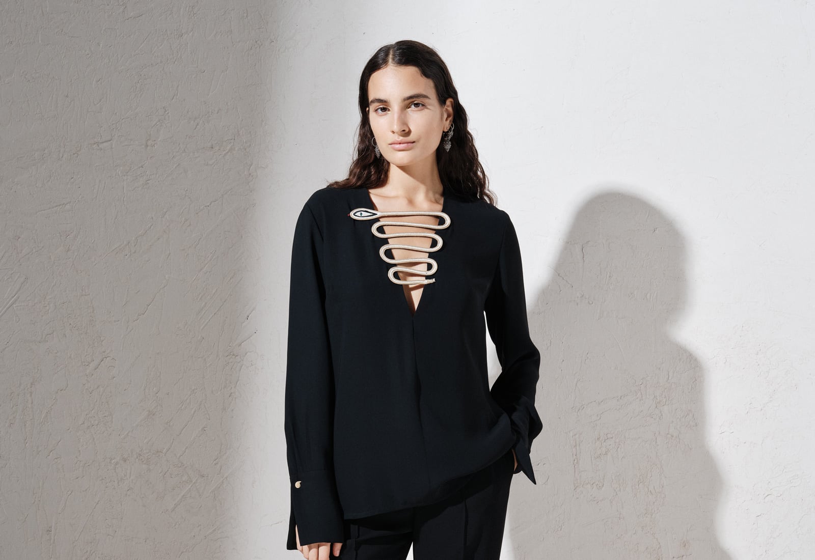 Pandora, who was the first mortal woman to be fashioned out of the earth by the gods and who endowed her with charm, both allured with her beauty and was allured by the secrets in a jar. The trailing serpent on the other hand is not only a symbol of rebirth and creative life force but also suggests temptation. These two starting points influence the recurring motifs that set the tone for this flirtatious collection. The keyhole necklines both reveal as well as disguise and are equally as narrow as they are deep. The decorative, embellished serpent on the other hand literally trails around garments seductively. The overall collection is marked by doric simplicity, an empowering play on geometric shapes created with dramatic cutouts, and a positively energetic use of color.