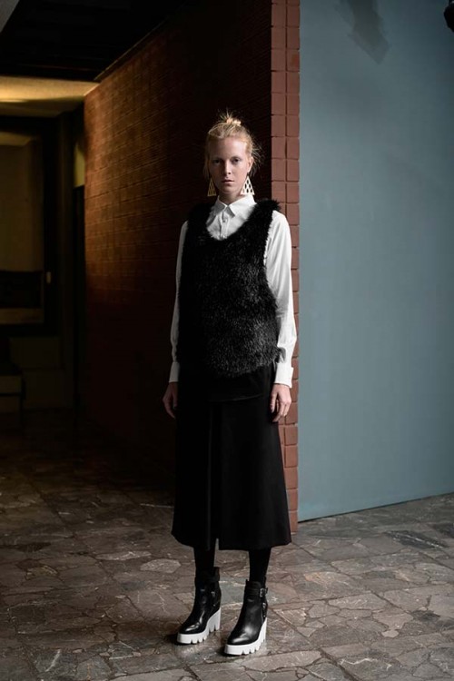 The AW14 woman collection ofย Stelios Koudounaris is subtle and modern, defined by bold layers, an androgynous attitude and a feminine and contemporary approach. The designs are modest and comprehensive but at the same time provocative. In a playful game between textures, colors and unconventional combinations of materials, black plays a key role, while emerald and burgundy have their own position. For this collection, Stelios Koudounaris created his own fabrics and rich knits, aristocratically jacquard from wool and silk, while experimenting for the first time with eco fur and a new material having a leather look and texture, while actually being a print on cotton gabardine. The dominant proposal through this collection is the combination of casual with evening pieces so that all clothes gain even more usability. Itโs addressed to women who want to be both elegant and comfortable throughout the day.