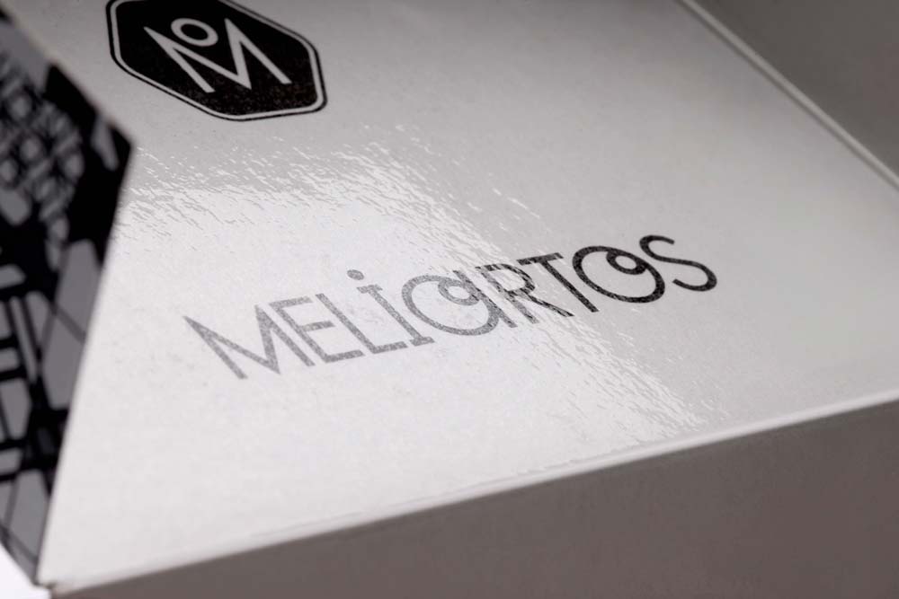 All applications unveil elegant details influenced by tile motifs in the neoclassical homes of old Athens. The decorative pattern system is visually strong and allows flexible design choices. It is, therefore, not always necessary to read the logo in order to recognize the brand. The vibrant colors of Meliartos attract the attention thanks to the absence of background color. In the black and white packaging series, there is a small detail worth mentioning: going against what’s usually expected, the logo on the paper box can be seen after opening it up and while the customer enjoys its contents. The brand identity has also ‘invaded’ the store’s walls and floors, and details from the logo make an eye-catching statement as they appear on certain tiles.