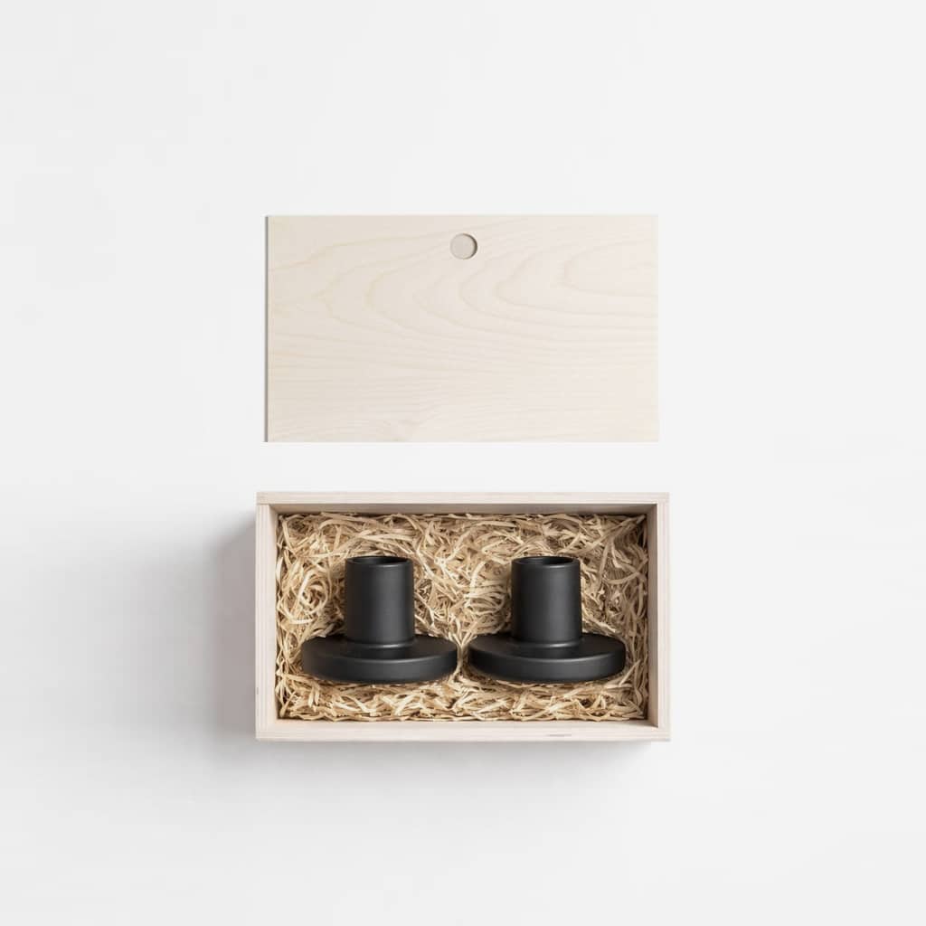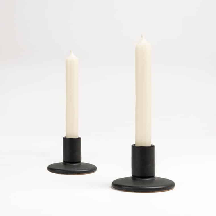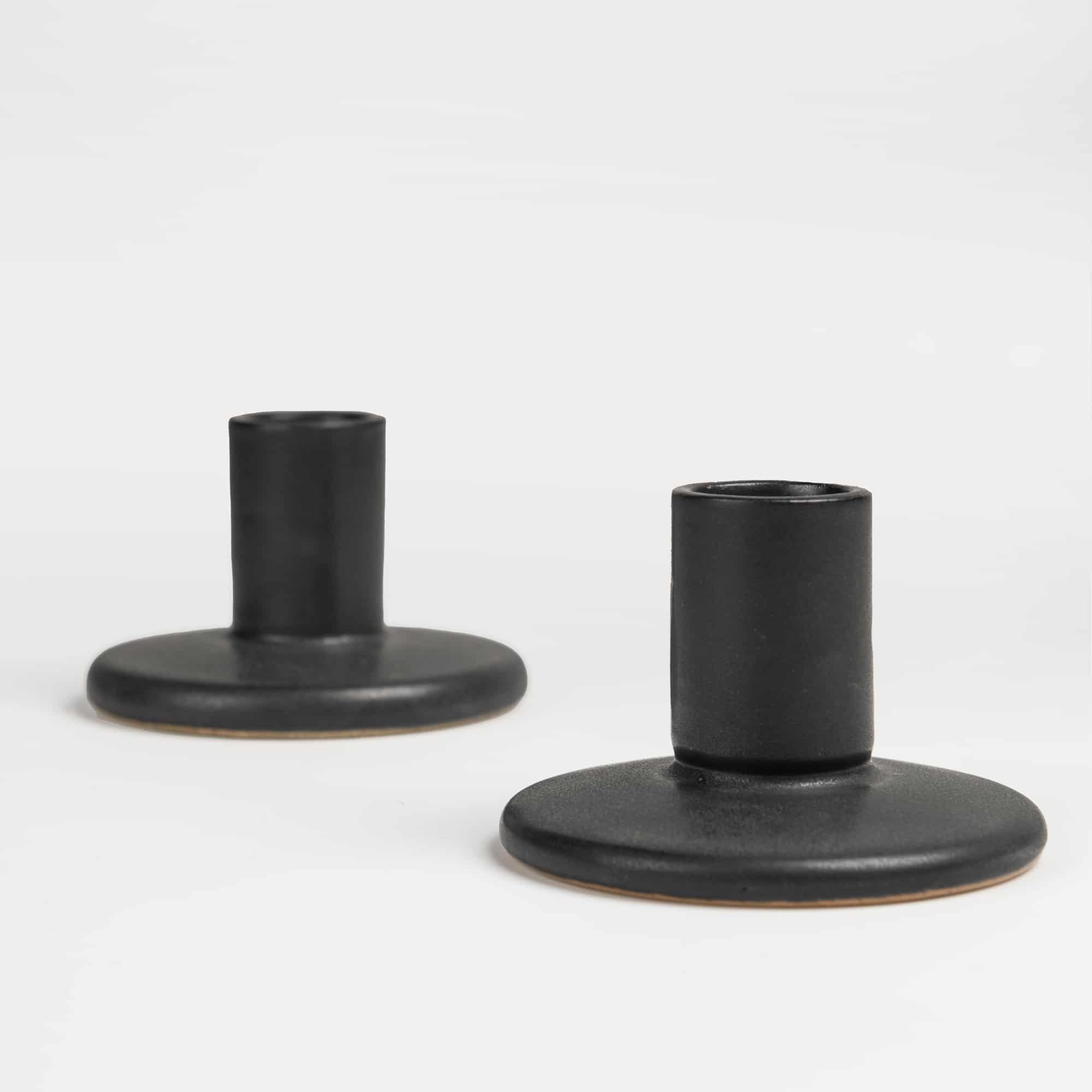 Set of two handcrafted ceramic candle holders in black. Designed for dining tables and interior use.