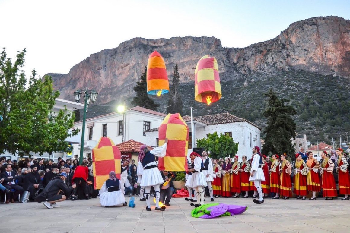Further south, in Leonidio, the mood shifts again. As midnight approaches, lanterns are released slowly into the sky. There is no single moment to watch for, just a gradual lifting, one after another, until they begin to gather above the town.