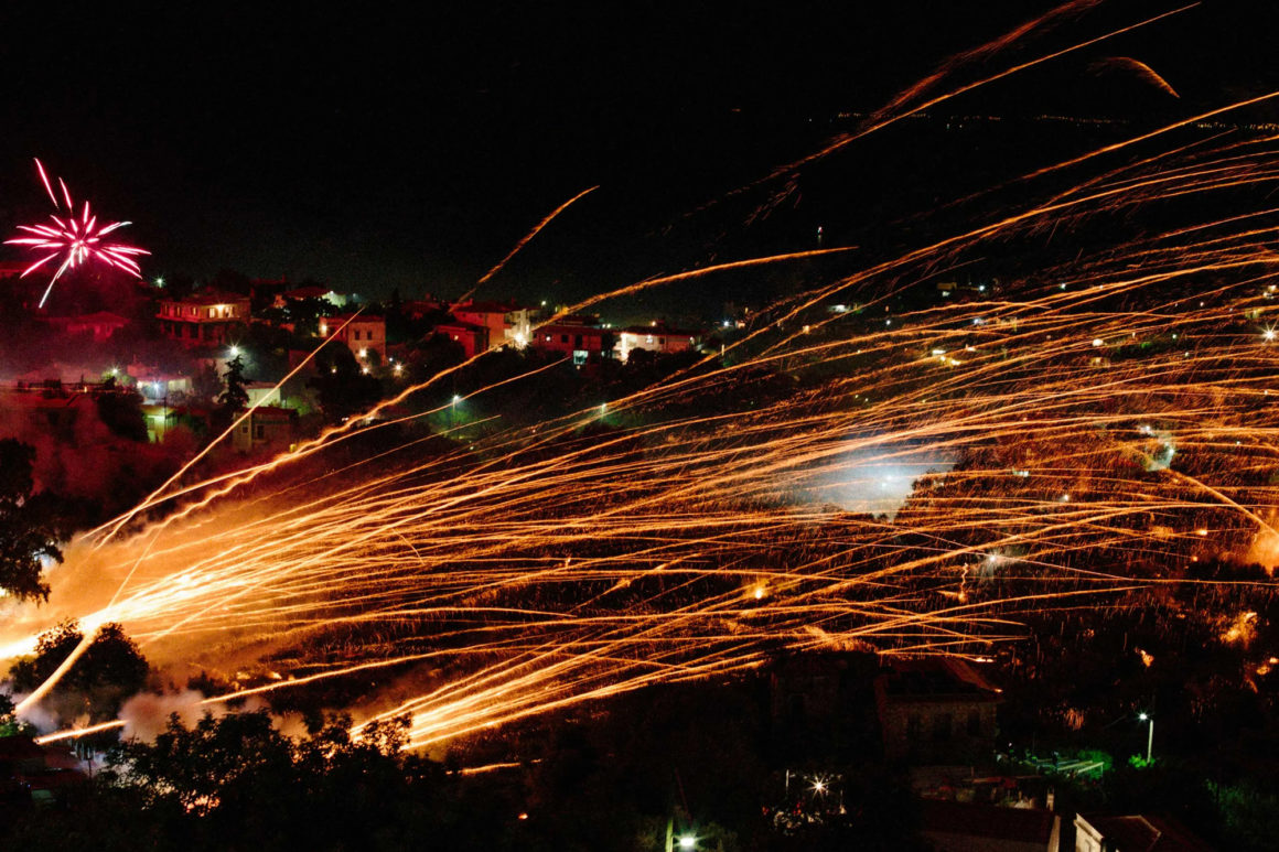 In Vrontados, on Chios, Easter takes on a different energy. As night falls, rockets begin to cross the sky between two churches facing each other across the hillside. The sound builds quickly, sharp, continuous, and the air fills with streaks of light.