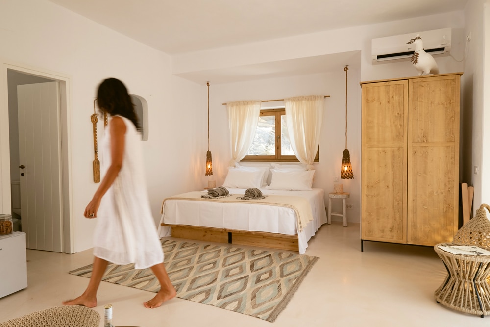 Kea, one of the Cycladic islandsโ most laid-back destinations, has just got even more zen for yogis and lovers of slow living and nature-conscious traveling. Nestled amid rolling hills sloping down to Keaโs Psathi beach, Kea Retreat is as much a spiritual retreat as it is a celebration of the islandโs natural landscape and cultural heritage. Seamlessly blending into the rocky landscape, a series of existing 400-year-old stone-built structures (a traditional type of Cycladic farmhouse called โkathikiesโ) have been transformed into austere yet elegant guest rooms, complete with sea views, private verandas, and outdoor showers. A muted palette of earthy tones and natural materials imbues the rooms with calmness and warmth. Local artisansโ works furnish the rooms with bespoke pieces.