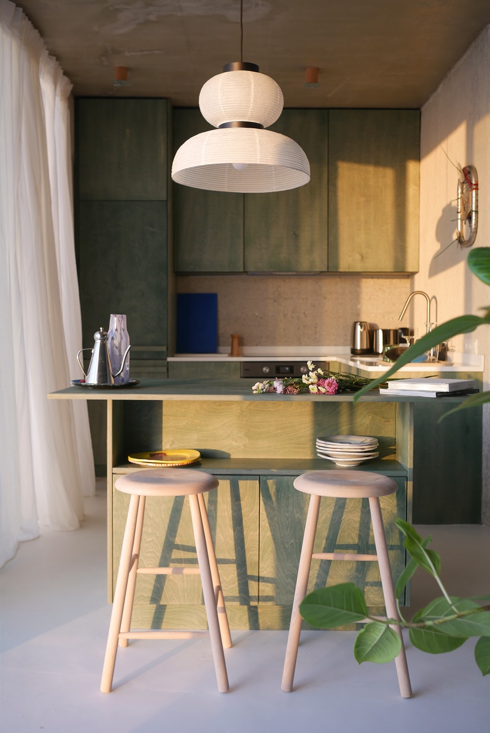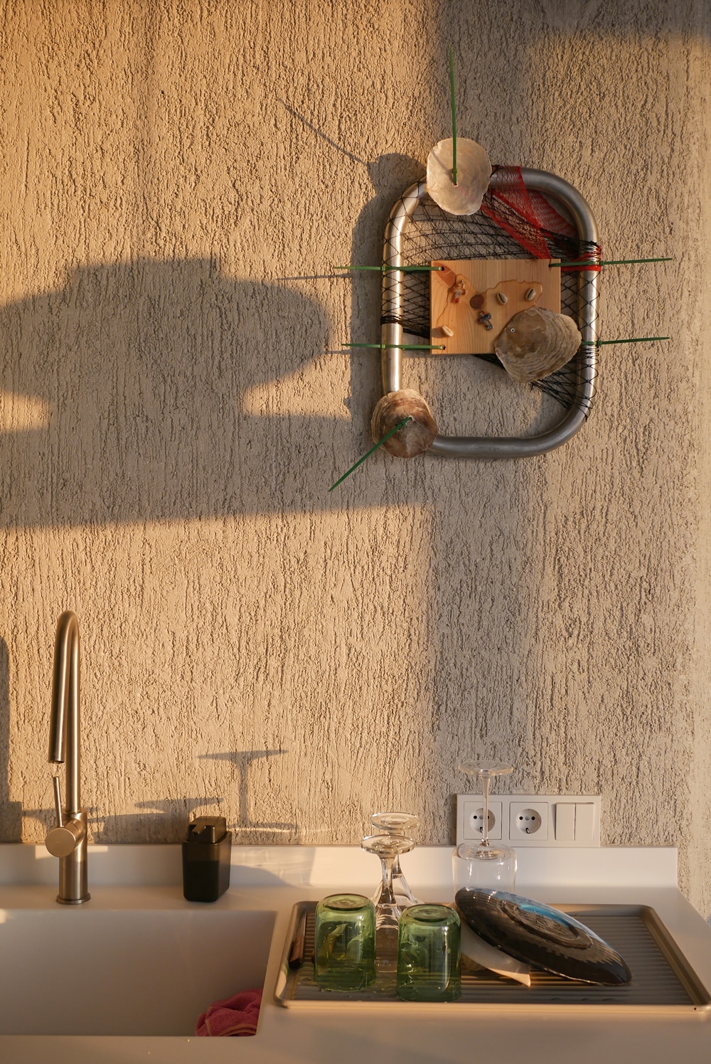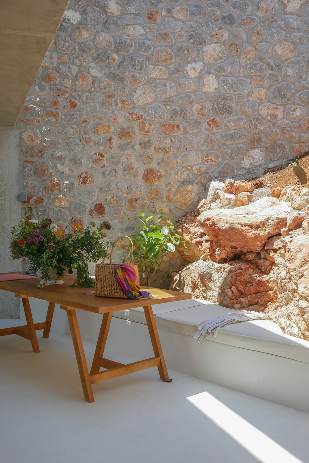 The front of the building consists of a sunbathing area and a private pool with an infinite sea view. The backyard is a quiet and shady area that works as an extension of the house. Most of the furniture is specially designed by the artist, while the houses feature new art pieces every year, with three artists (Evgenia Ioannidou, Orestis Lazouras, and Mirto Tzima) exhibiting at the moment. Ceramic plates, glasses, and utensils are custom-made by Korkodilos ceramic studio in Athens, while LASPIโs visual identity is designed by Athens-based studio OGUST and is based on a custom font inspired by the buildingโs architecture.