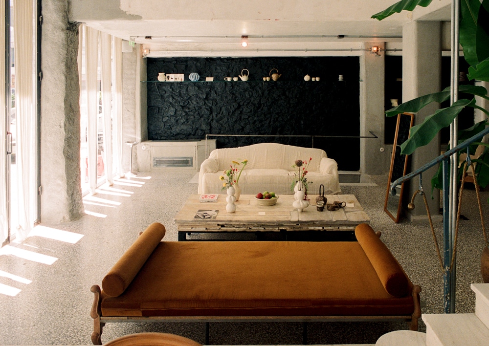Double-floor height windows give a sense of brightness and space on the ground floor, yet the room is subtly lit to invite intimacy. An open-plan kitchen provides guests with a Levantine breakfast and hosts regular supper clubs. Every surface, from walls to coffee tables, is a miniature art installation, with ceramics, paintings and photographs for sale. The original mosaic floor and marble staircase contrast with warm custom-made furniture in textures of wood and velvet. The original metal frames of the windows and the wrought iron staircase are offset by whimsical flower arrangements bringing the color and beauty of nature indoors. Mona’s suites are furnished with organic Greek-made linens, mattresses and hung with ethereal drapes and dresses, all of which are available for purchase.